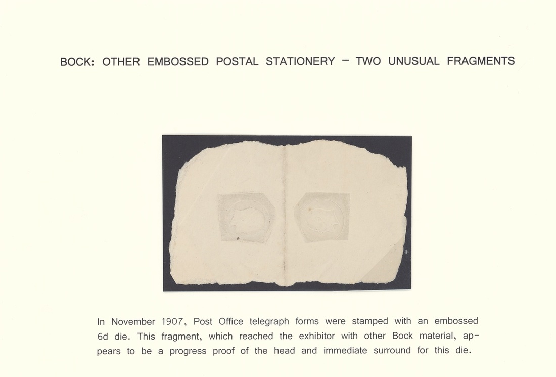 1907 King Edward VII progress proof of the embossed King's Head on fragment of a Post Office telegraph form. Also a 1½d. stationery envelope cut out in brown, prepared for private postal stationery for