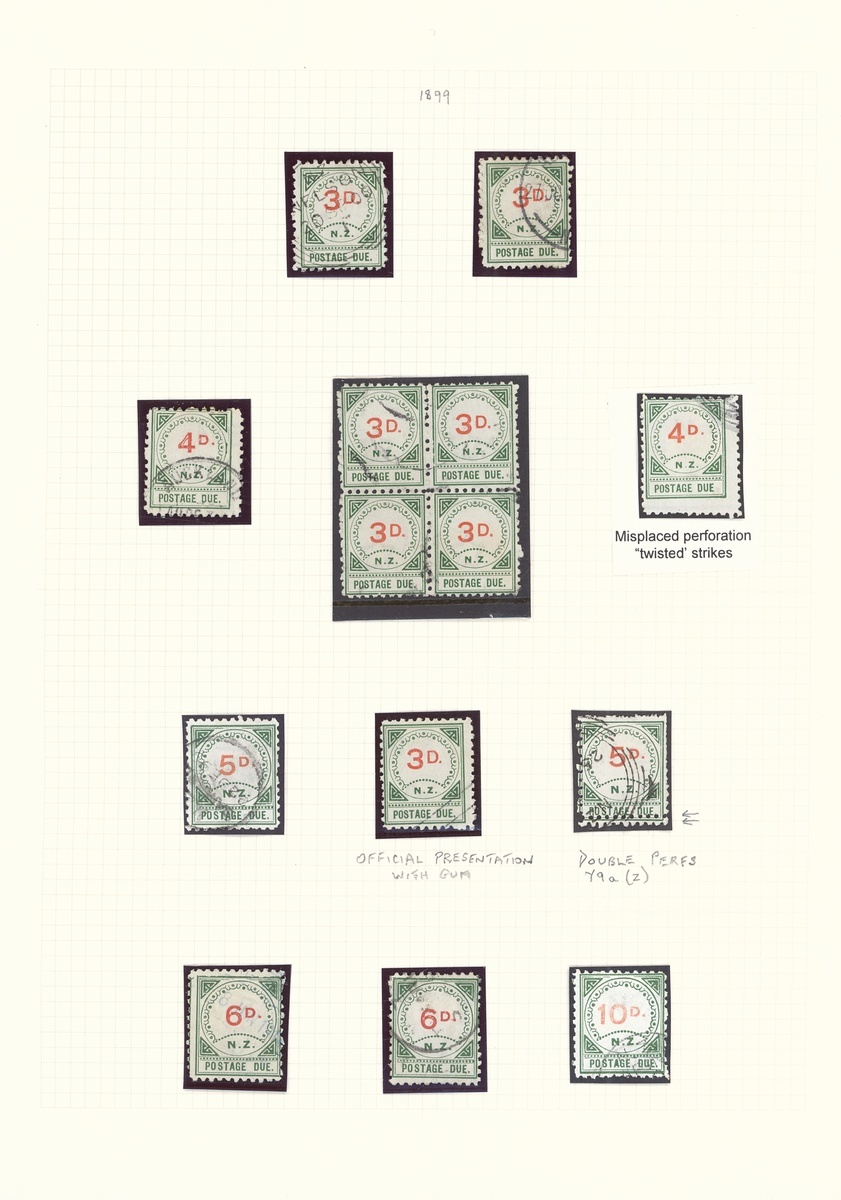 1899-1900 first type study on album pages with the complete set of issues to 2/- used including 3d. (2) and 8d. blocks, 5d. with double perfs and unlisted varieties, etc., chiefly good to fine . S.G. D1-16 group, £2,300+