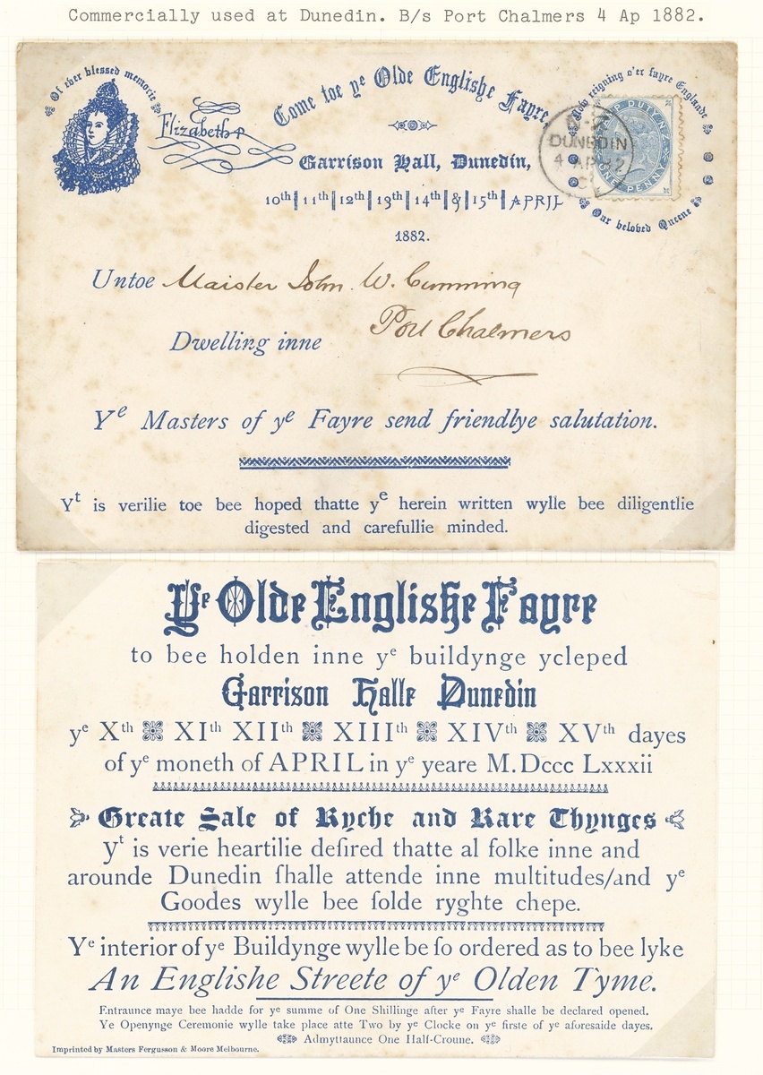 1882 (4 Apr.) illustrated commercial cover used locally to Port Chalmers complete with original invitation to attend 'Ye Olde English Fayre' at Dunedin, bearing 1882 1d. blue affixed at upper right and tied by
