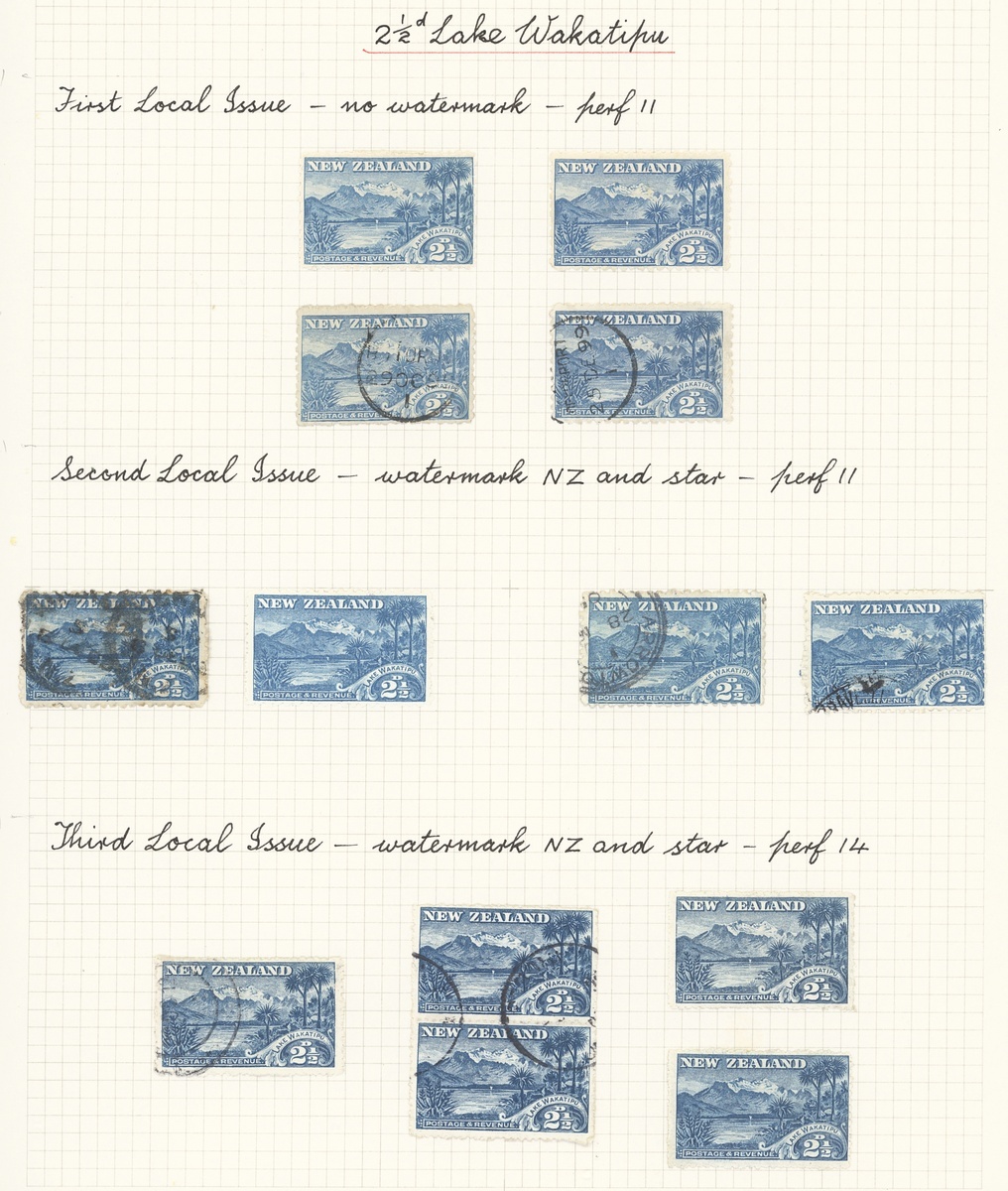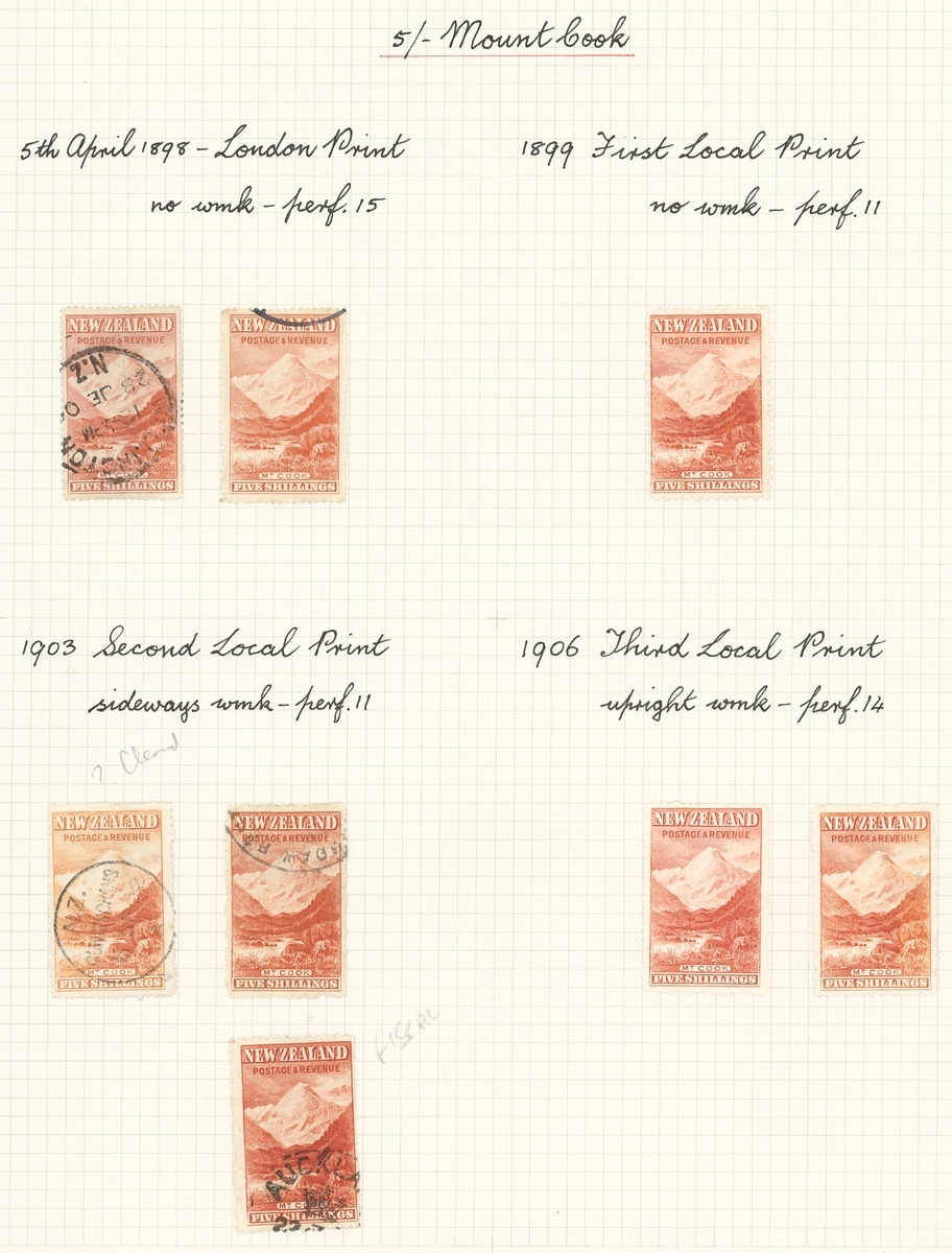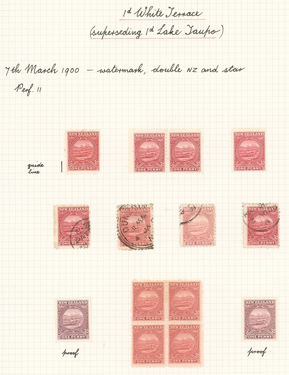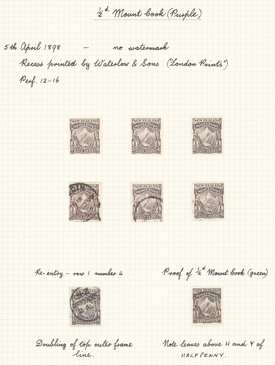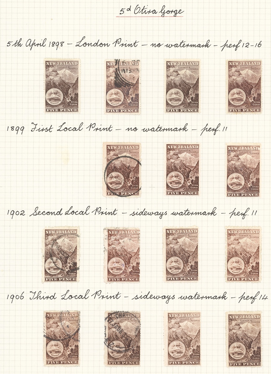 Collection in a blue album, including ½d. with proofs, mint block of six, shades, re-entry, 1d. Taupo with mint block of four, strip of three, 1d. White Terrace with 4 mint blocks of four, shades, proofs, 1½d. with perfs., shades, [R1/12] re-entry, 2d. Pembroke Peak with proofs, perf. varieties, local print with blocks, shades, re-entries, 2½d. with shades and printings, 3d. shades and perfs., [R10/] re-entry contained in a corner block of four, 4d. White Terrace [R8/8] re-entry contained in a pair, 4d. Taupo with all printings, shades, re-entries, watermark varieties, 5d. Otira Gorge with printings, shades, re-entries, 6d. Kiwi with shades, small format with printings, proof, 8d. War Canoe with shades, printings, re-entry, 9d. printings, shades, re-entries, 1/- with printings, shades, small format, 2/- shades, 5/- London print (2 used). no wmk., perf. 11 unused and used, etc., chiefly good to fine