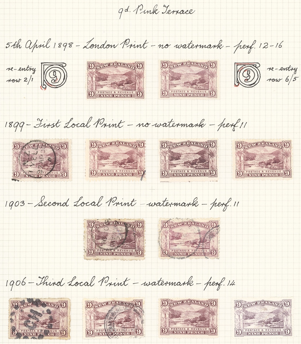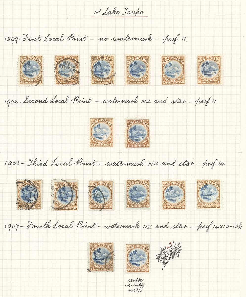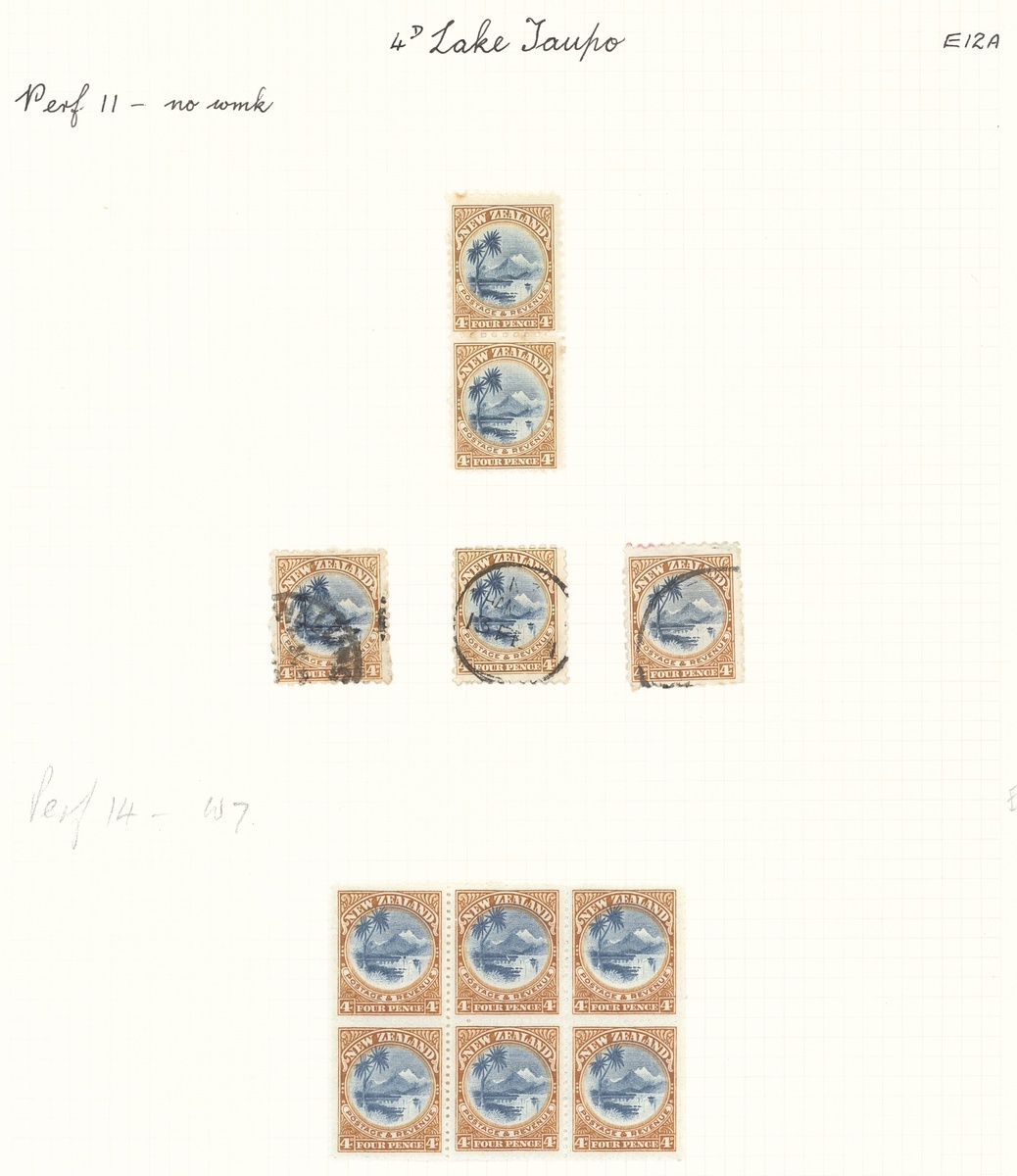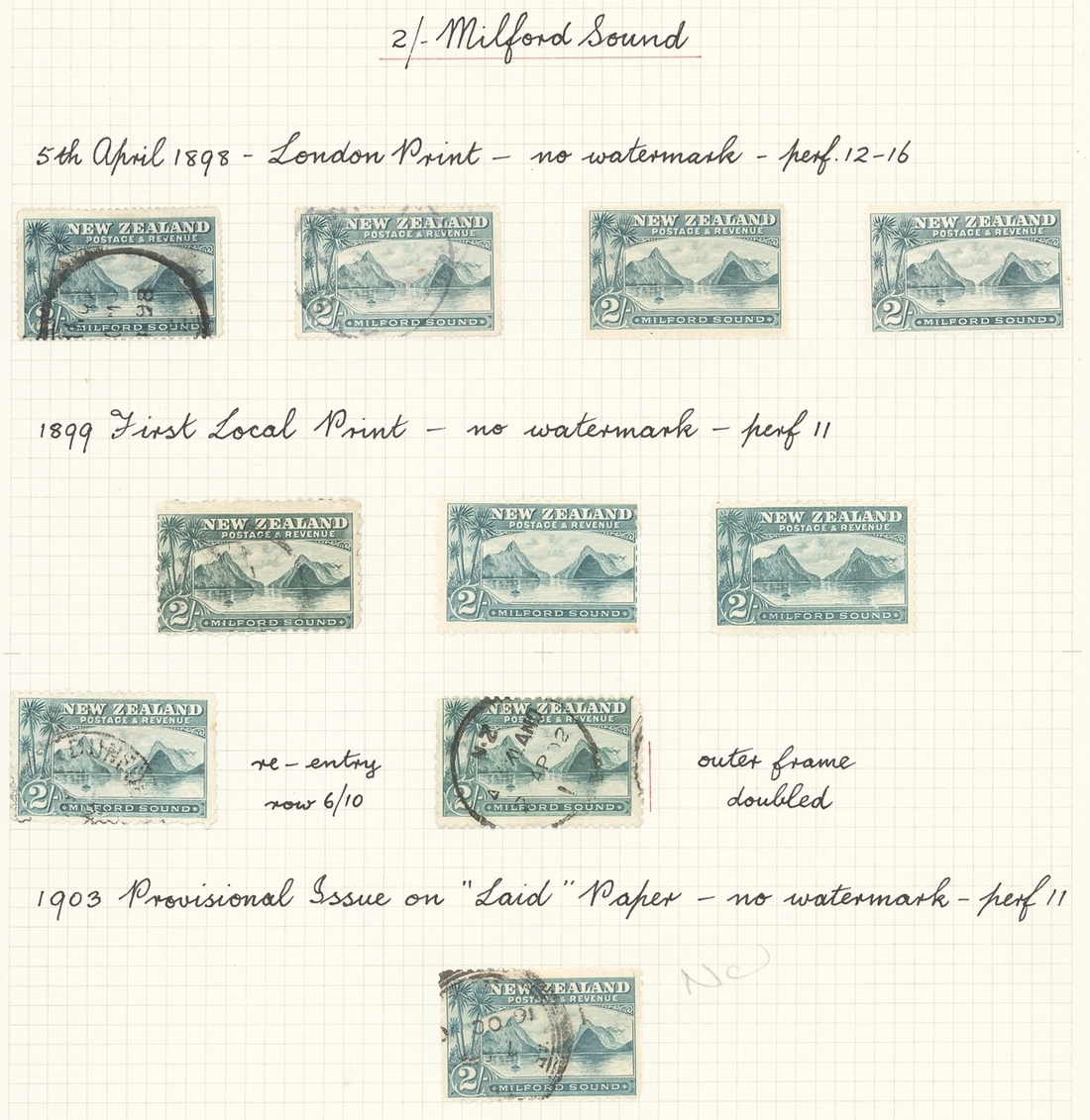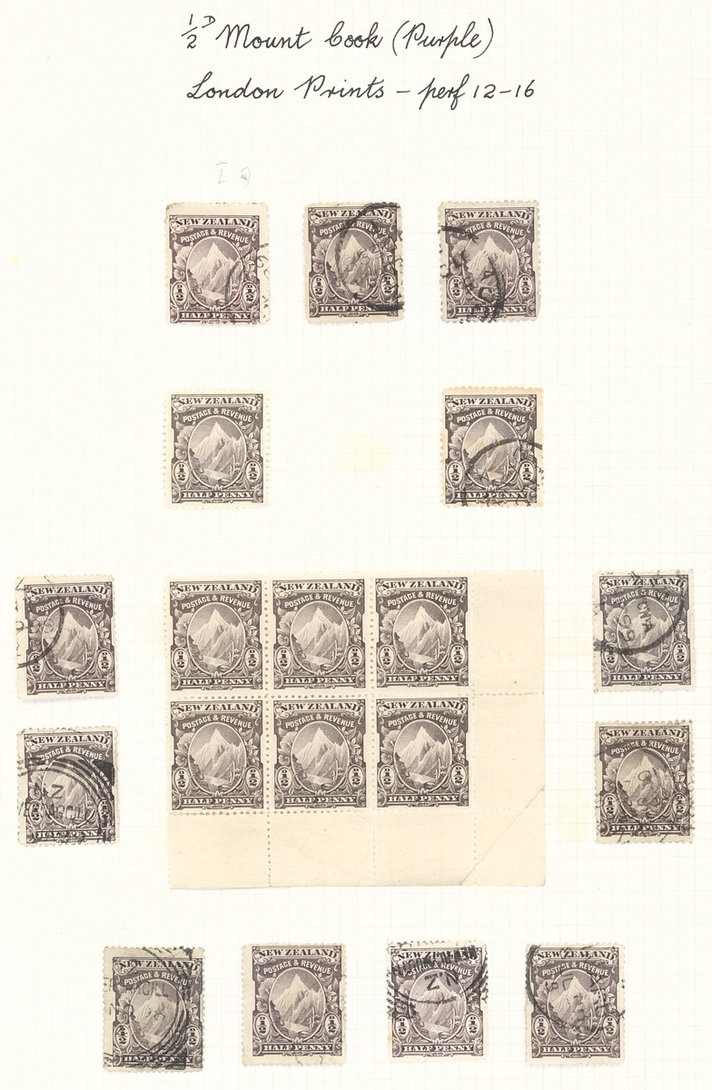Collection in a blue album, including ½d. with proofs, mint block of six, shades, re-entry, 1d. Taupo with mint block of four, strip of three, 1d. White Terrace with 4 mint blocks of four, shades, proofs, 1½d. with perfs., shades, [R1/12] re-entry, 2d. Pembroke Peak with proofs, perf. varieties, local print with blocks, shades, re-entries, 2½d. with shades and printings, 3d. shades and perfs., [R10/] re-entry contained in a corner block of four, 4d. White Terrace [R8/8] re-entry contained in a pair, 4d. Taupo with all printings, shades, re-entries, watermark varieties, 5d. Otira Gorge with printings, shades, re-entries, 6d. Kiwi with shades, small format with printings, proof, 8d. War Canoe with shades, printings, re-entry, 9d. printings, shades, re-entries, 1/- with printings, shades, small format, 2/- shades, 5/- London print (2 used). no wmk., perf. 11 unused and used, etc., chiefly good to fine