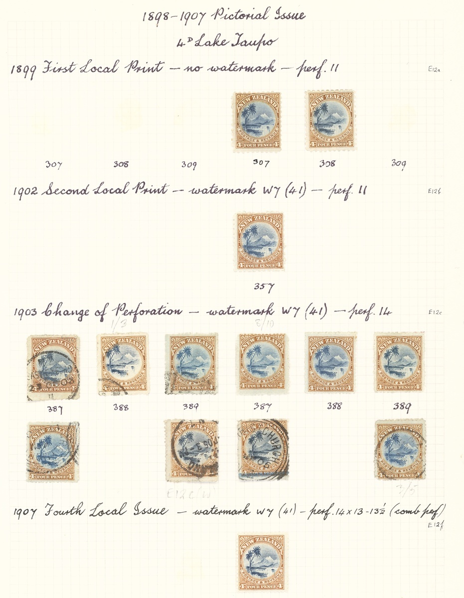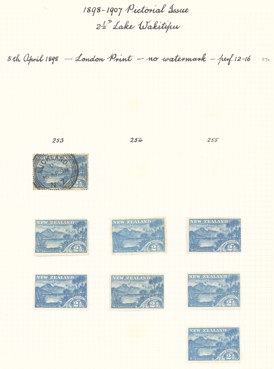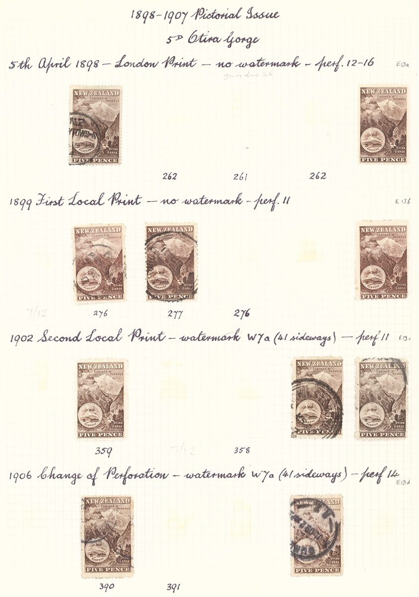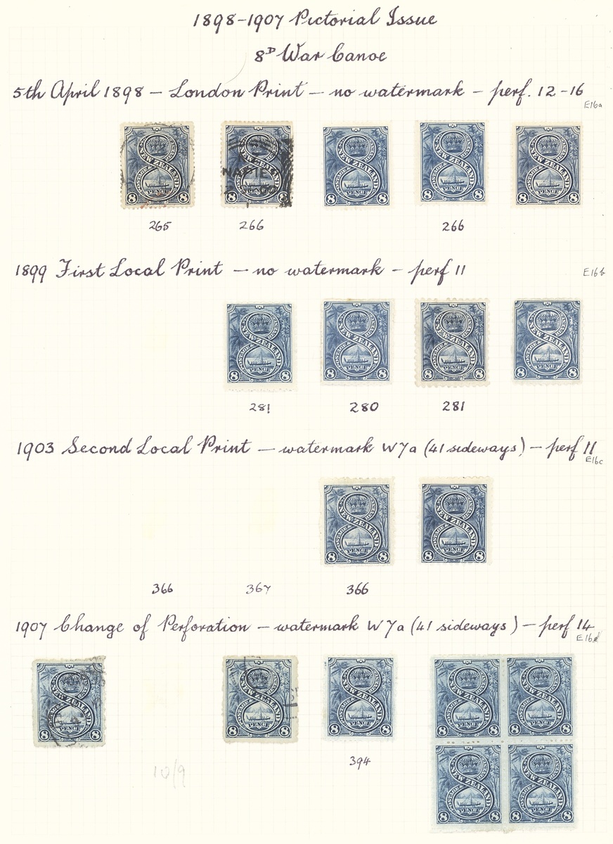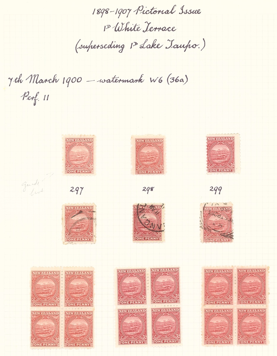 Collection in a blue album, including ½d. with proofs, mint block of six, shades, re-entry, 1d. Taupo with mint block of four, strip of three, 1d. White Terrace with 4 mint blocks of four, shades, proofs, 1½d. with perfs., shades, [R1/12] re-entry, 2d. Pembroke Peak with proofs, perf. varieties, local print with blocks, shades, re-entries, 2½d. with shades and printings, 3d. shades and perfs., [R10/] re-entry contained in a corner block of four, 4d. White Terrace [R8/8] re-entry contained in a pair, 4d. Taupo with all printings, shades, re-entries, watermark varieties, 5d. Otira Gorge with printings, shades, re-entries, 6d. Kiwi with shades, small format with printings, proof, 8d. War Canoe with shades, printings, re-entry, 9d. printings, shades, re-entries, 1/- with printings, shades, small format, 2/- shades, 5/- London print (2 used). no wmk., perf. 11 unused and used, etc., chiefly good to fine