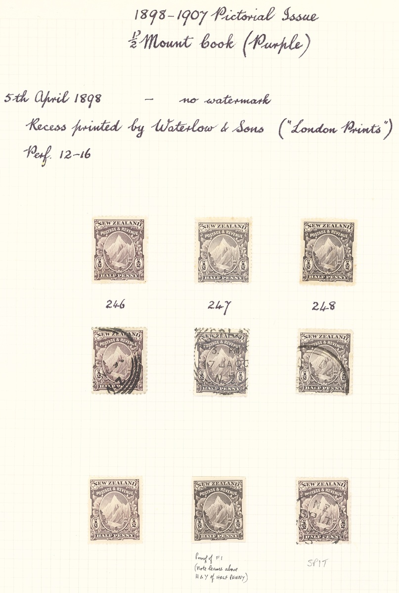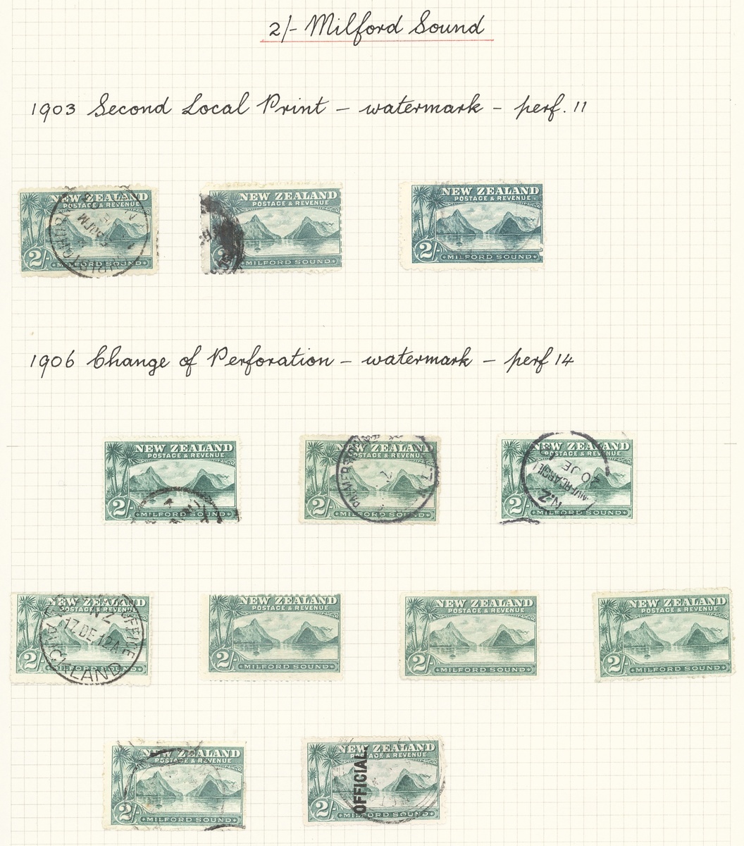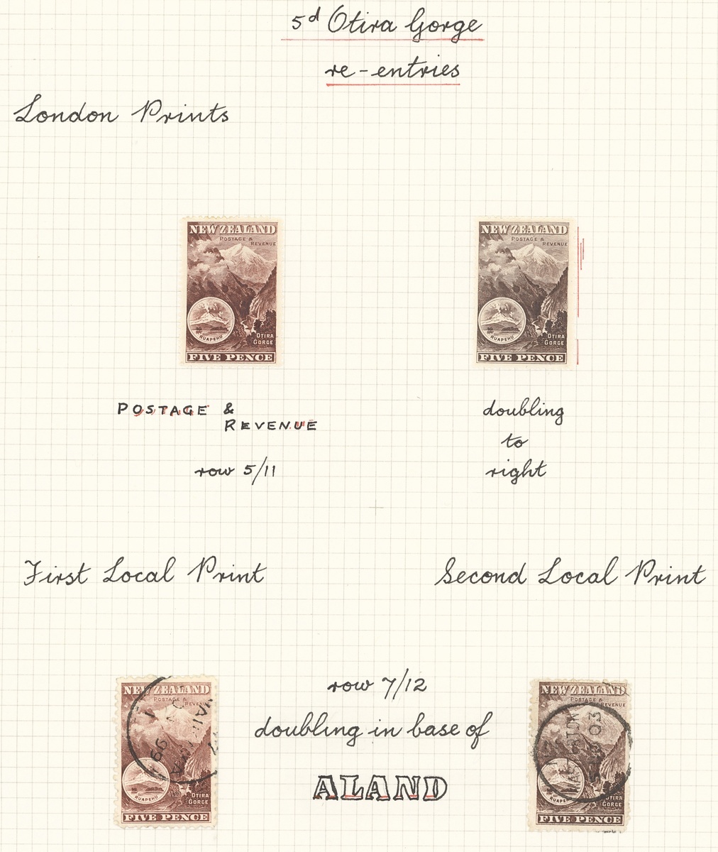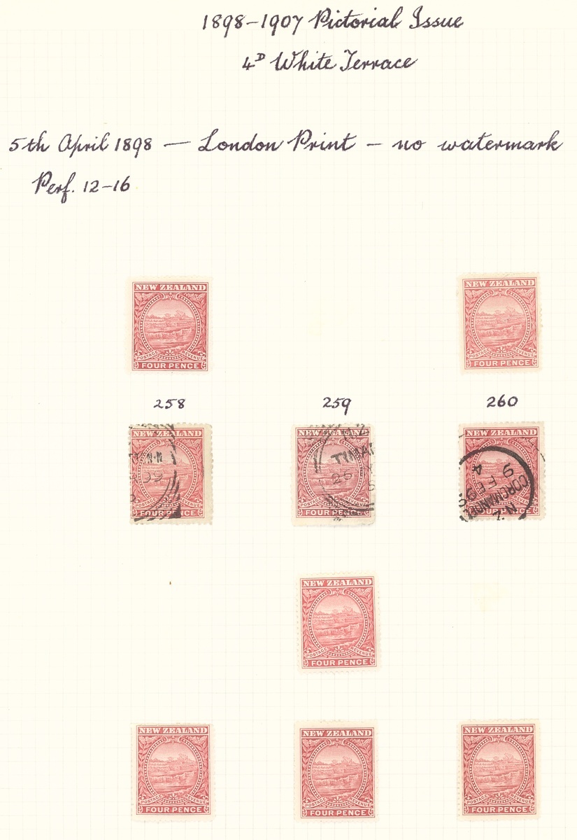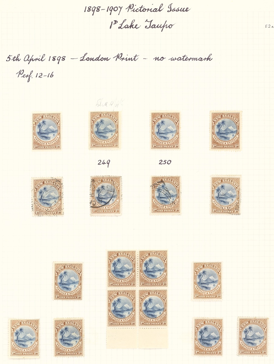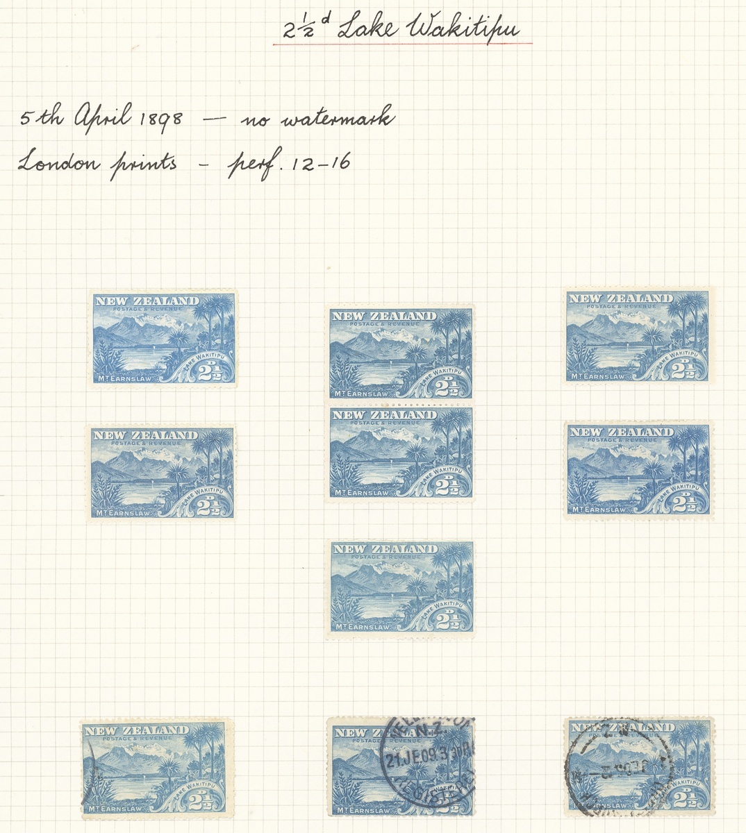 Collection in a blue album, including ½d. with proofs, mint block of six, shades, re-entry, 1d. Taupo with mint block of four, strip of three, 1d. White Terrace with 4 mint blocks of four, shades, proofs, 1½d. with perfs., shades, [R1/12] re-entry, 2d. Pembroke Peak with proofs, perf. varieties, local print with blocks, shades, re-entries, 2½d. with shades and printings, 3d. shades and perfs., [R10/] re-entry contained in a corner block of four, 4d. White Terrace [R8/8] re-entry contained in a pair, 4d. Taupo with all printings, shades, re-entries, watermark varieties, 5d. Otira Gorge with printings, shades, re-entries, 6d. Kiwi with shades, small format with printings, proof, 8d. War Canoe with shades, printings, re-entry, 9d. printings, shades, re-entries, 1/- with printings, shades, small format, 2/- shades, 5/- London print (2 used). no wmk., perf. 11 unused and used, etc., chiefly good to fine