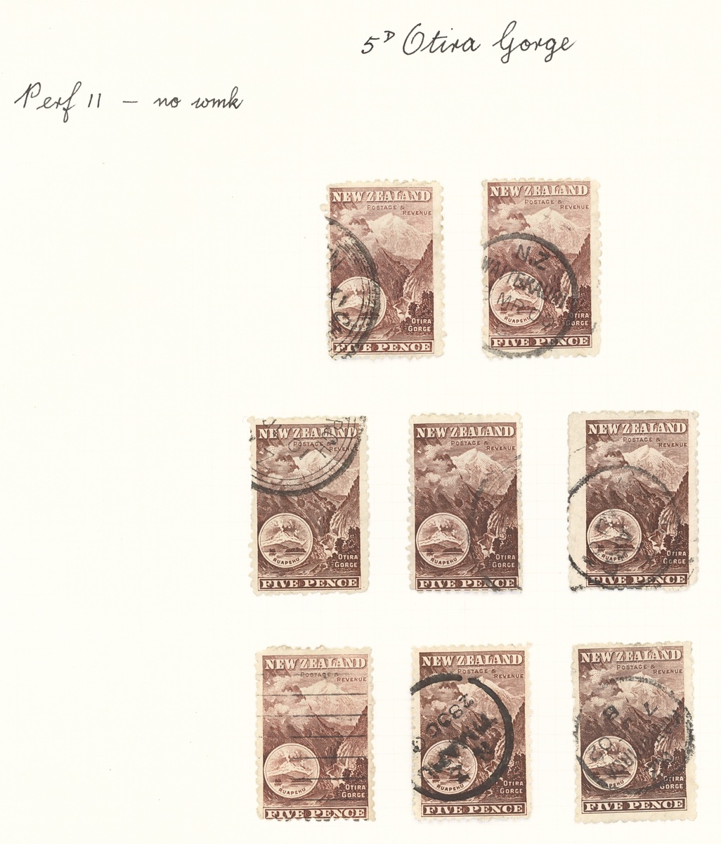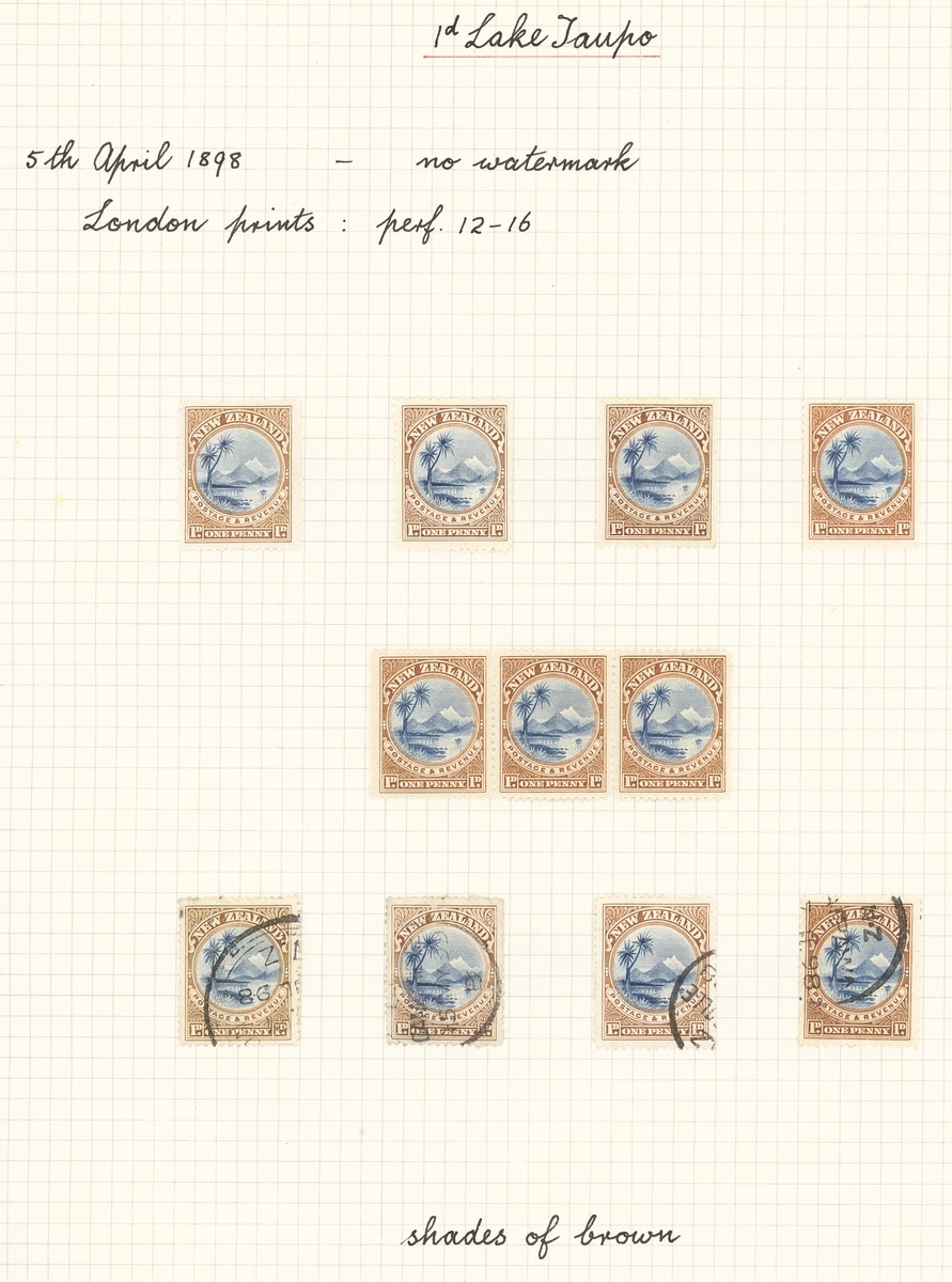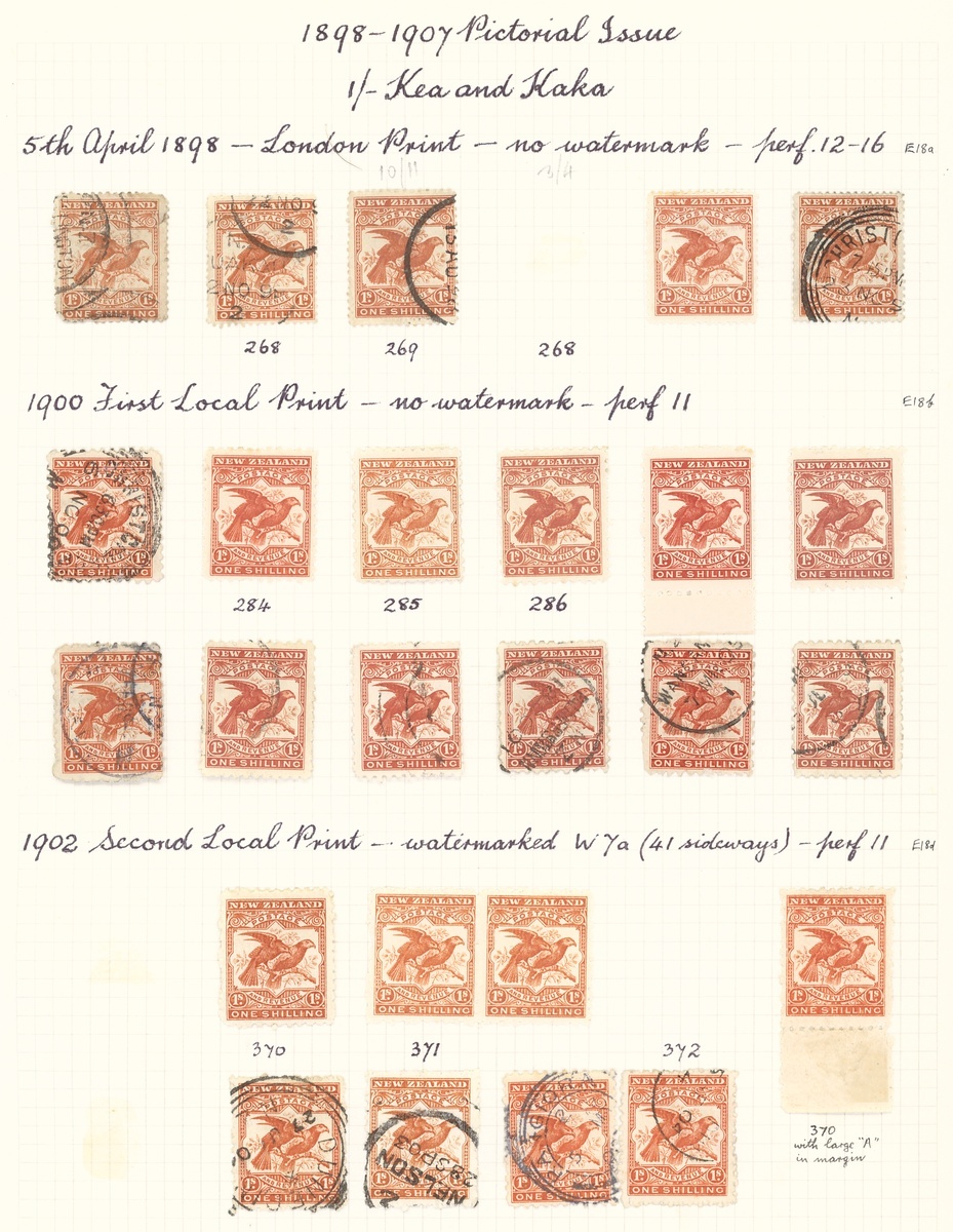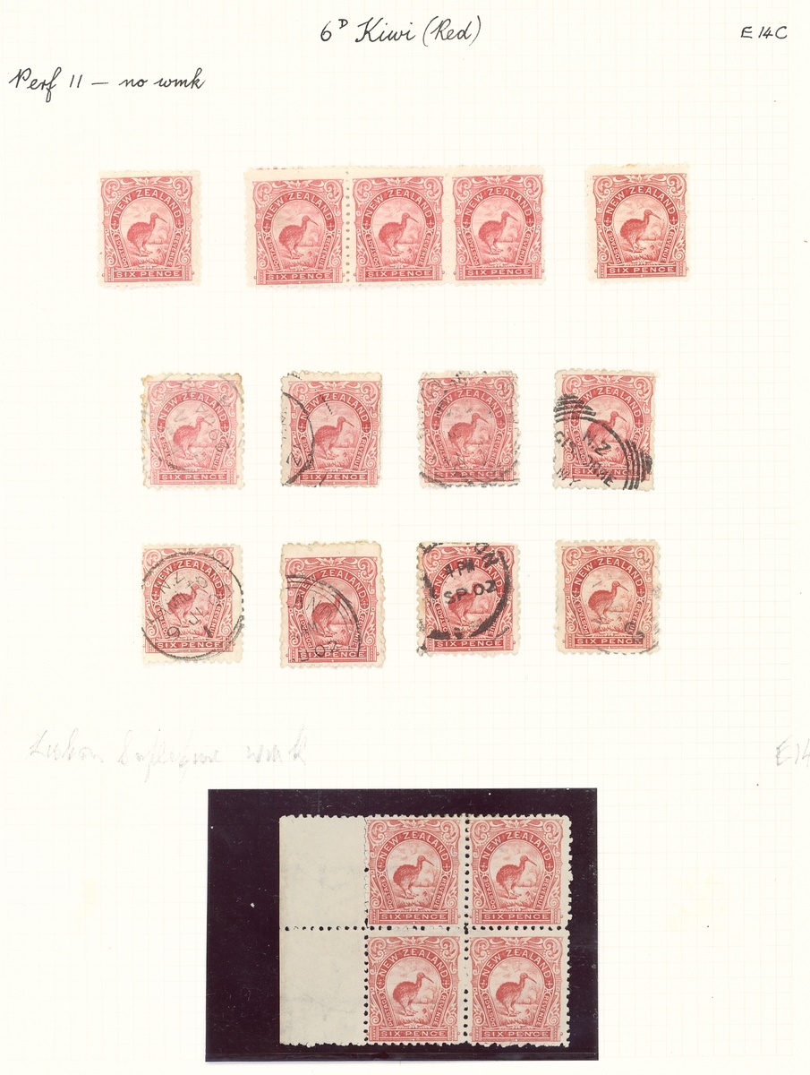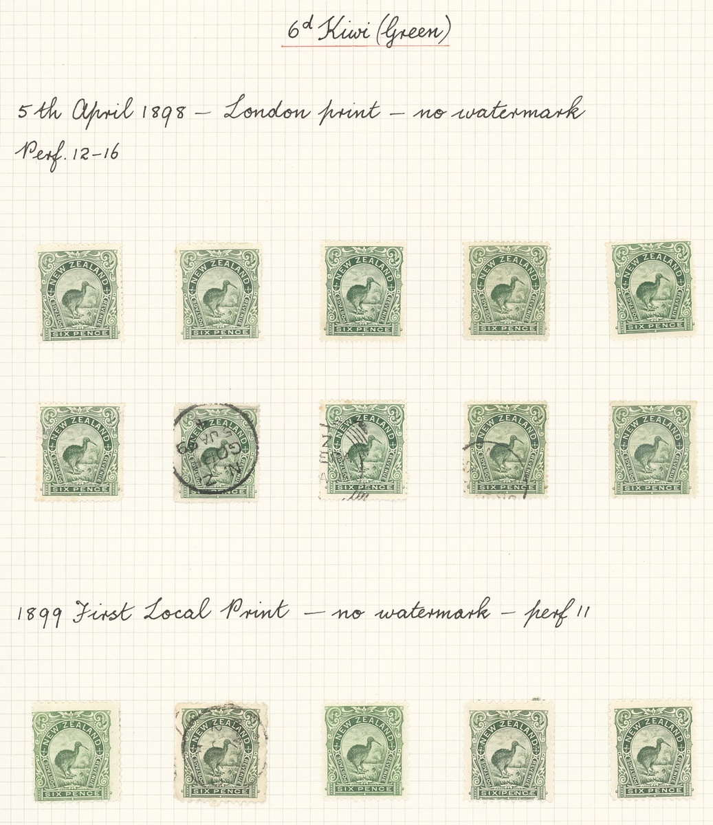 Collection in a blue album, including ½d. with proofs, mint block of six, shades, re-entry, 1d. Taupo with mint block of four, strip of three, 1d. White Terrace with 4 mint blocks of four, shades, proofs, 1½d. with perfs., shades, [R1/12] re-entry, 2d. Pembroke Peak with proofs, perf. varieties, local print with blocks, shades, re-entries, 2½d. with shades and printings, 3d. shades and perfs., [R10/] re-entry contained in a corner block of four, 4d. White Terrace [R8/8] re-entry contained in a pair, 4d. Taupo with all printings, shades, re-entries, watermark varieties, 5d. Otira Gorge with printings, shades, re-entries, 6d. Kiwi with shades, small format with printings, proof, 8d. War Canoe with shades, printings, re-entry, 9d. printings, shades, re-entries, 1/- with printings, shades, small format, 2/- shades, 5/- London print (2 used). no wmk., perf. 11 unused and used, etc., chiefly good to fine