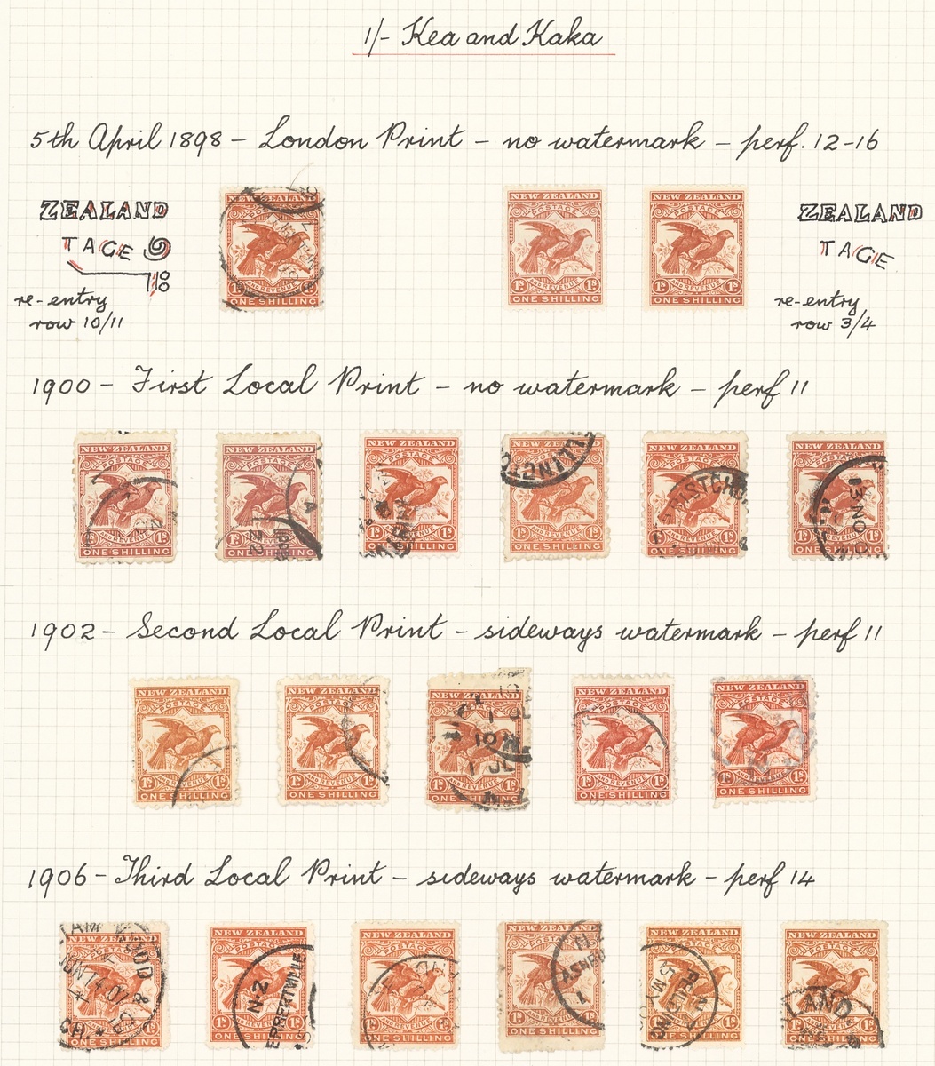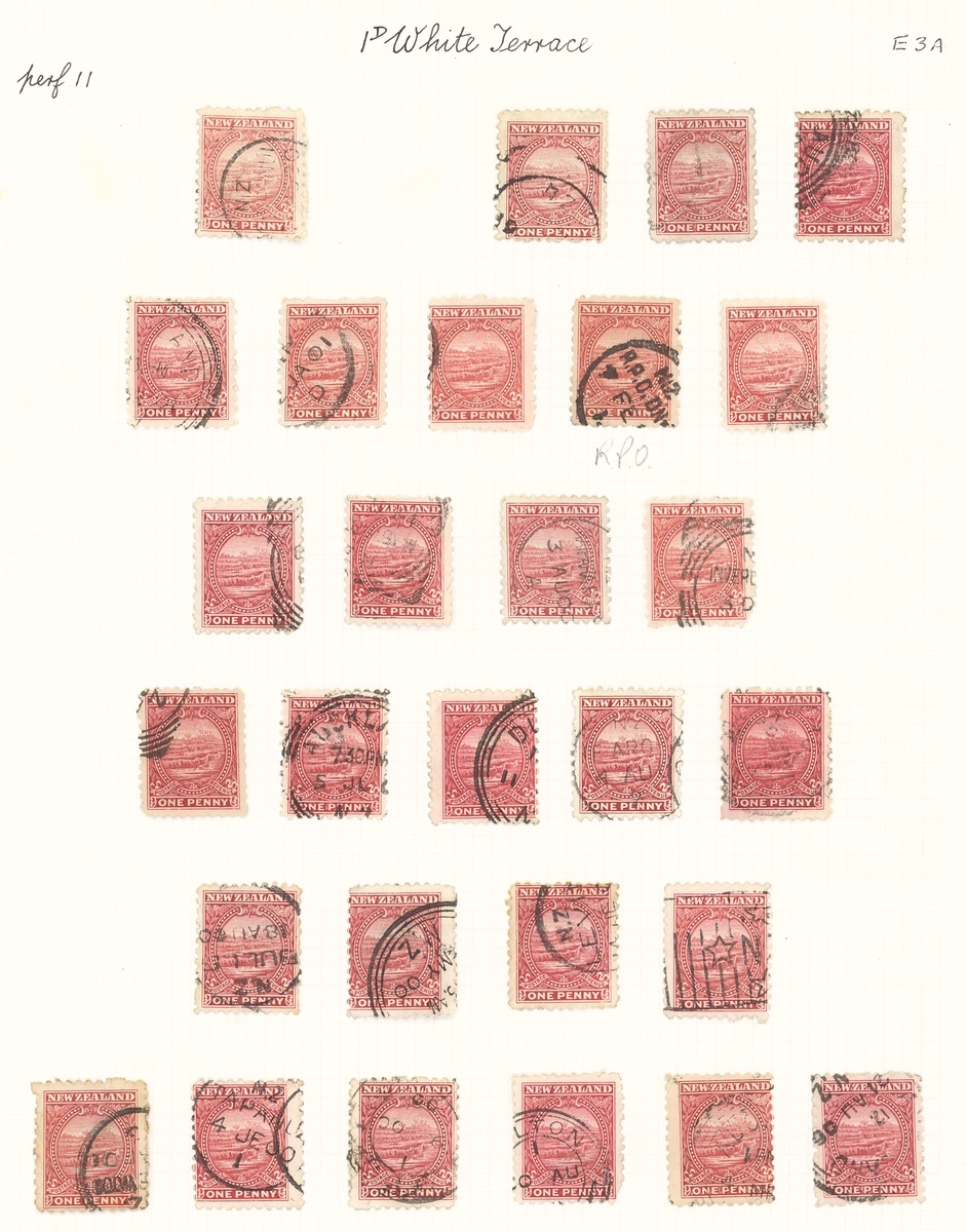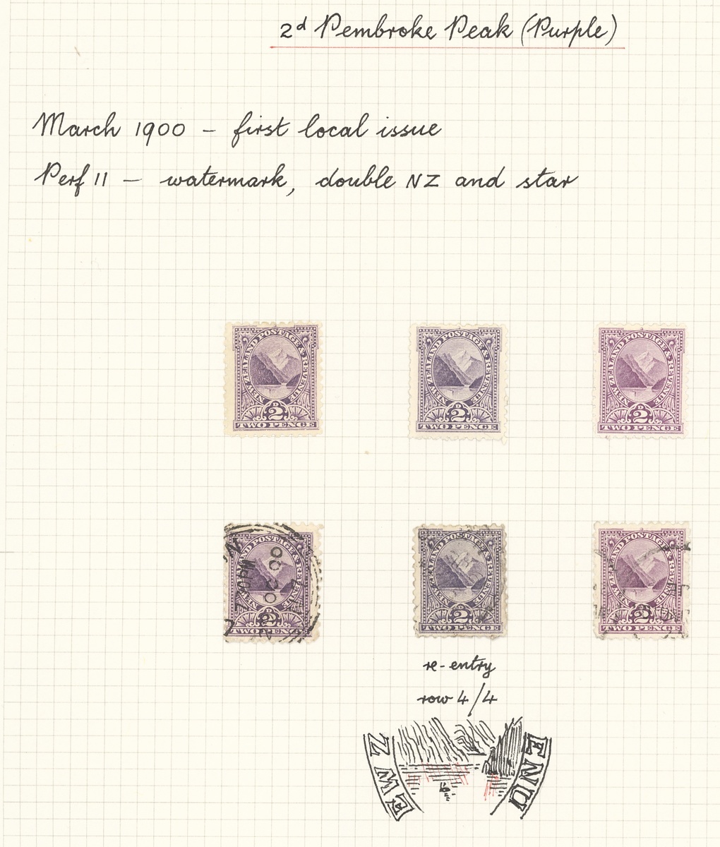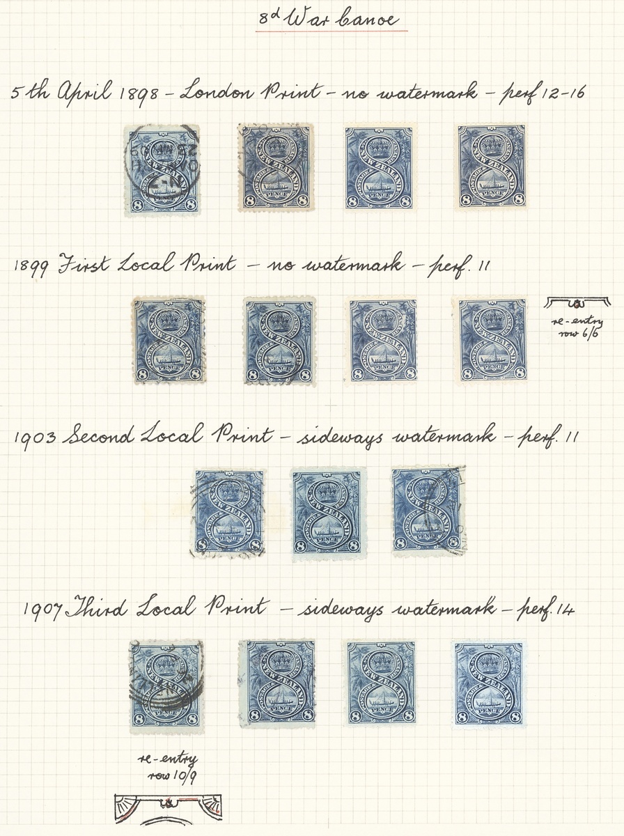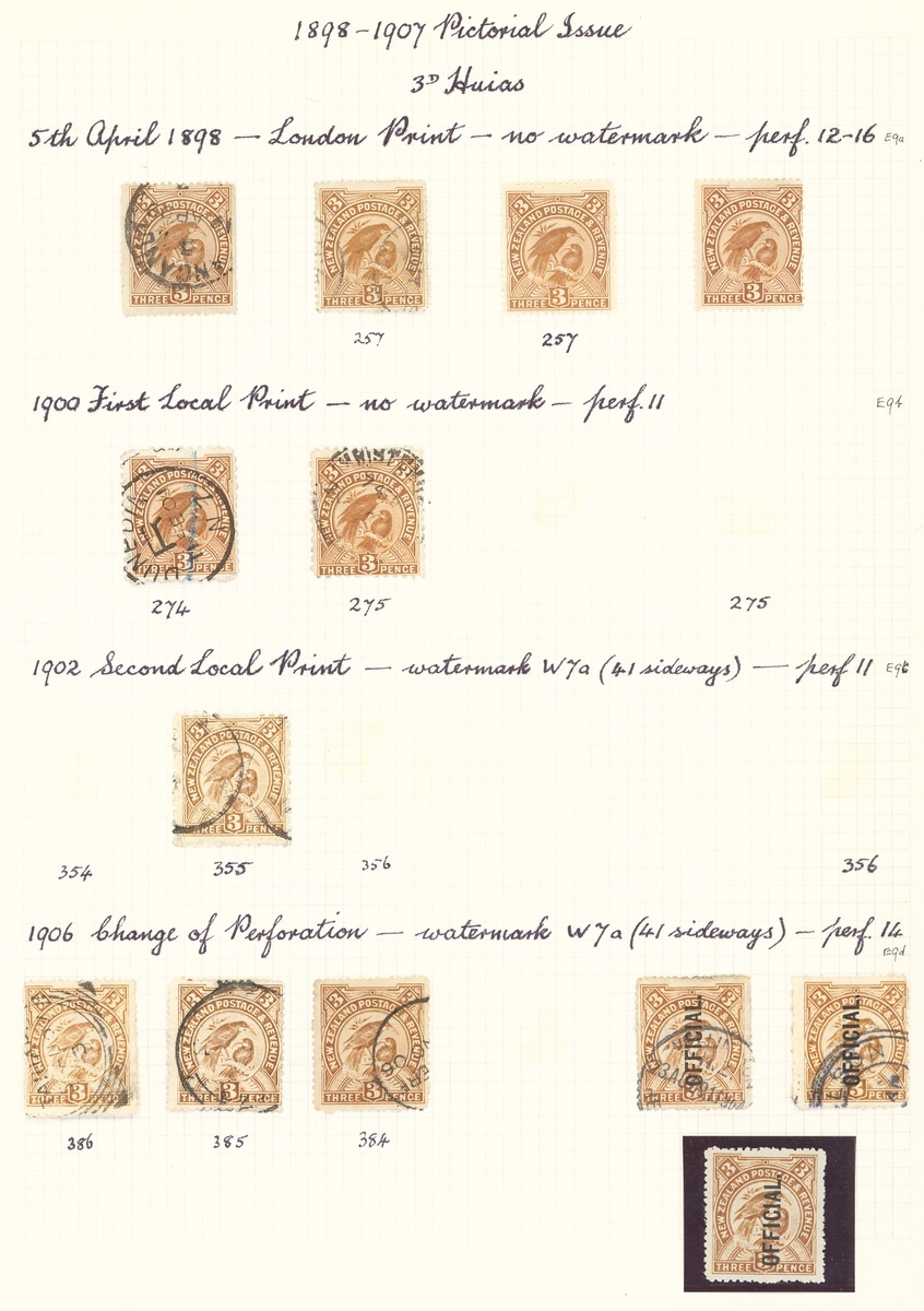 Collection in a blue album, including ½d. with proofs, mint block of six, shades, re-entry, 1d. Taupo with mint block of four, strip of three, 1d. White Terrace with 4 mint blocks of four, shades, proofs, 1½d. with perfs., shades, [R1/12] re-entry, 2d. Pembroke Peak with proofs, perf. varieties, local print with blocks, shades, re-entries, 2½d. with shades and printings, 3d. shades and perfs., [R10/] re-entry contained in a corner block of four, 4d. White Terrace [R8/8] re-entry contained in a pair, 4d. Taupo with all printings, shades, re-entries, watermark varieties, 5d. Otira Gorge with printings, shades, re-entries, 6d. Kiwi with shades, small format with printings, proof, 8d. War Canoe with shades, printings, re-entry, 9d. printings, shades, re-entries, 1/- with printings, shades, small format, 2/- shades, 5/- London print (2 used). no wmk., perf. 11 unused and used, etc., chiefly good to fine