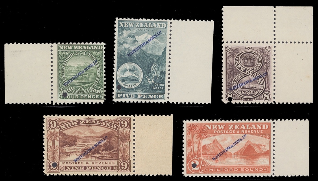 4d White Terrace green, 5d. Otira Gorge blue-green, 8d. War Canoe purple, 9d. Pink Terrace brown and 2/- Milford Sound orange, Proofs, each overprinted