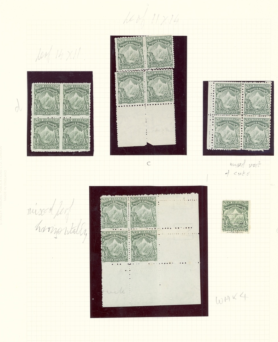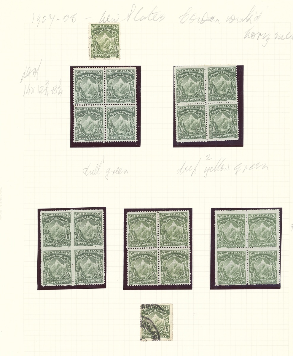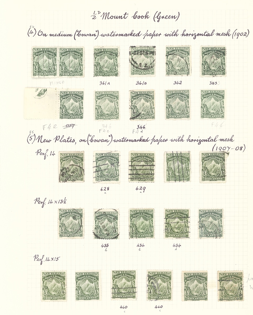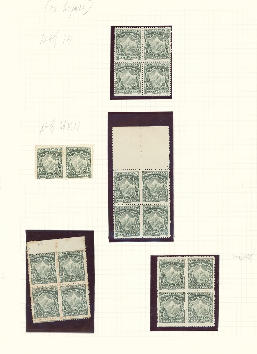 ½d. Mount Cook, mint and used collection (230+) on pages, including Waterlow sheet number block, mixed perf. block of four, 1901 mixed perfs. used pair, Basted Mills perf. 14 corner block of four, mixed perf. marginal strip of four, perf. 14 x 11 mint block of four, no watermark, perf. 14 corner block of four, perf. 14 x 11 block of six, single lined watermark with perf. 14 sheet number block of four, perf. 11 block of four, perf. 14 x 11 block of four, re-entries, knife cuts, varieties, Dickie black line overprints, proofs, a few Officials, etc., chiefly fine .