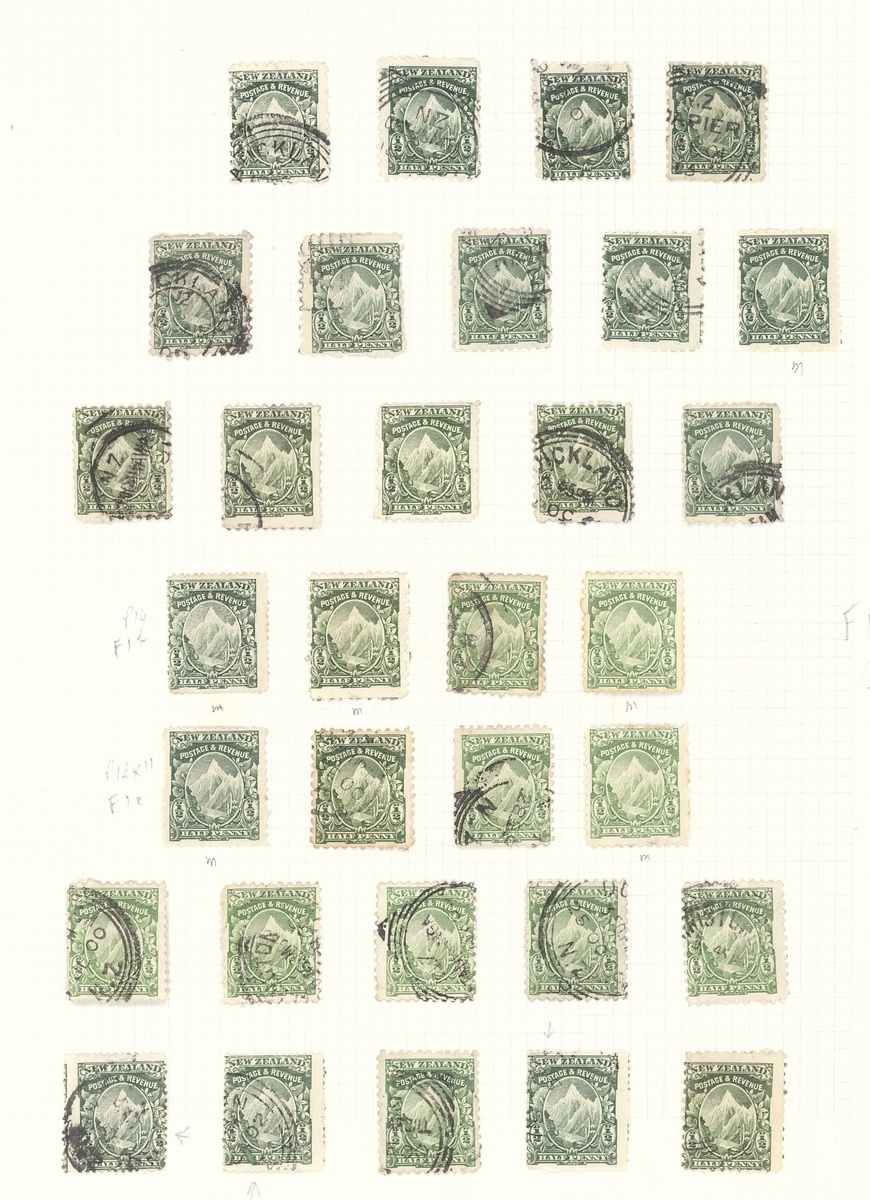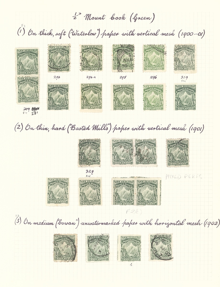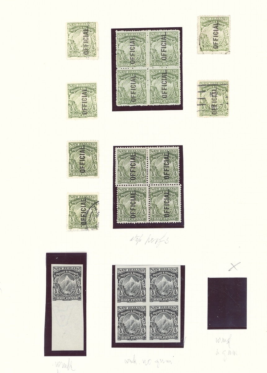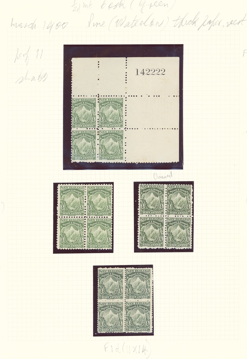 ½d. Mount Cook, mint and used collection (230+) on pages, including Waterlow sheet number block, mixed perf. block of four, 1901 mixed perfs. used pair, Basted Mills perf. 14 corner block of four, mixed perf. marginal strip of four, perf. 14 x 11 mint block of four, no watermark, perf. 14 corner block of four, perf. 14 x 11 block of six, single lined watermark with perf. 14 sheet number block of four, perf. 11 block of four, perf. 14 x 11 block of four, re-entries, knife cuts, varieties, Dickie black line overprints, proofs, a few Officials, etc., chiefly fine .