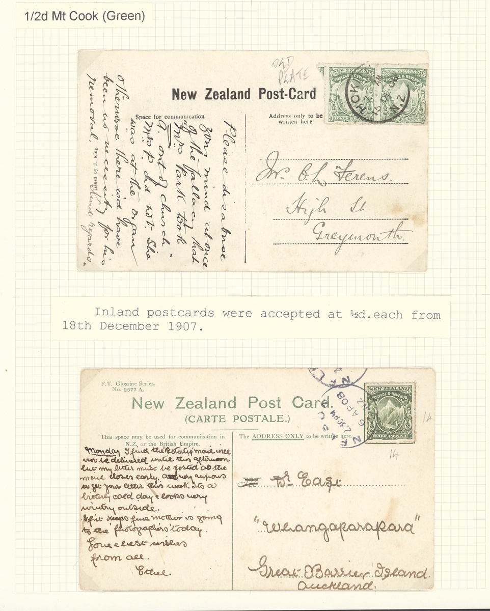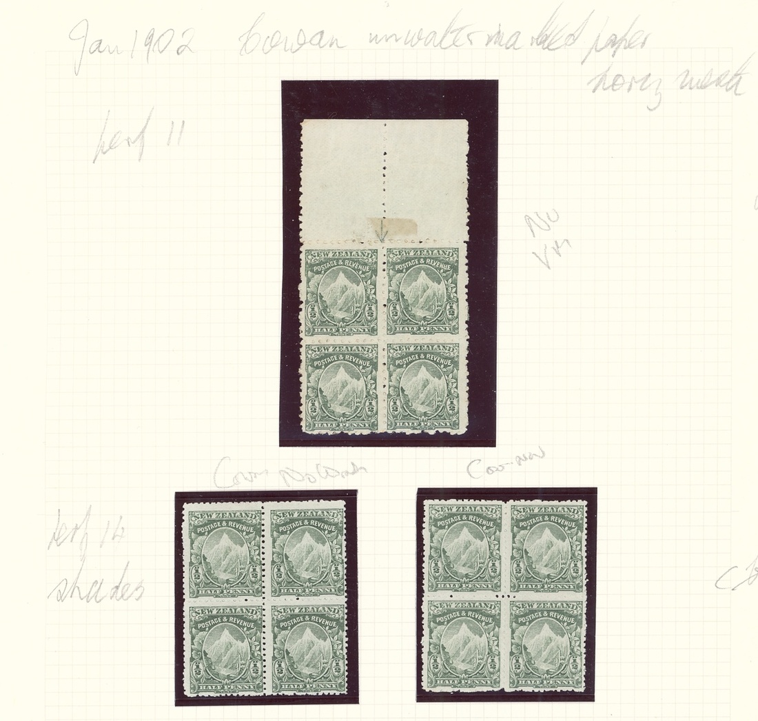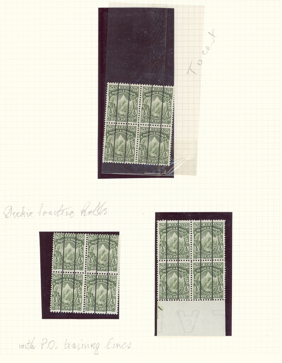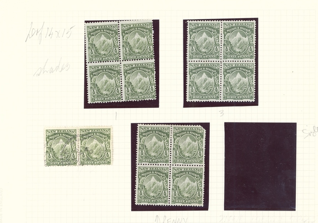½d. Mount Cook, mint and used collection (230+) on pages, including Waterlow sheet number block, mixed perf. block of four, 1901 mixed perfs. used pair, Basted Mills perf. 14 corner block of four, mixed perf. marginal strip of four, perf. 14 x 11 mint block of four, no watermark, perf. 14 corner block of four, perf. 14 x 11 block of six, single lined watermark with perf. 14 sheet number block of four, perf. 11 block of four, perf. 14 x 11 block of four, re-entries, knife cuts, varieties, Dickie black line overprints, proofs, a few Officials, etc., chiefly fine .