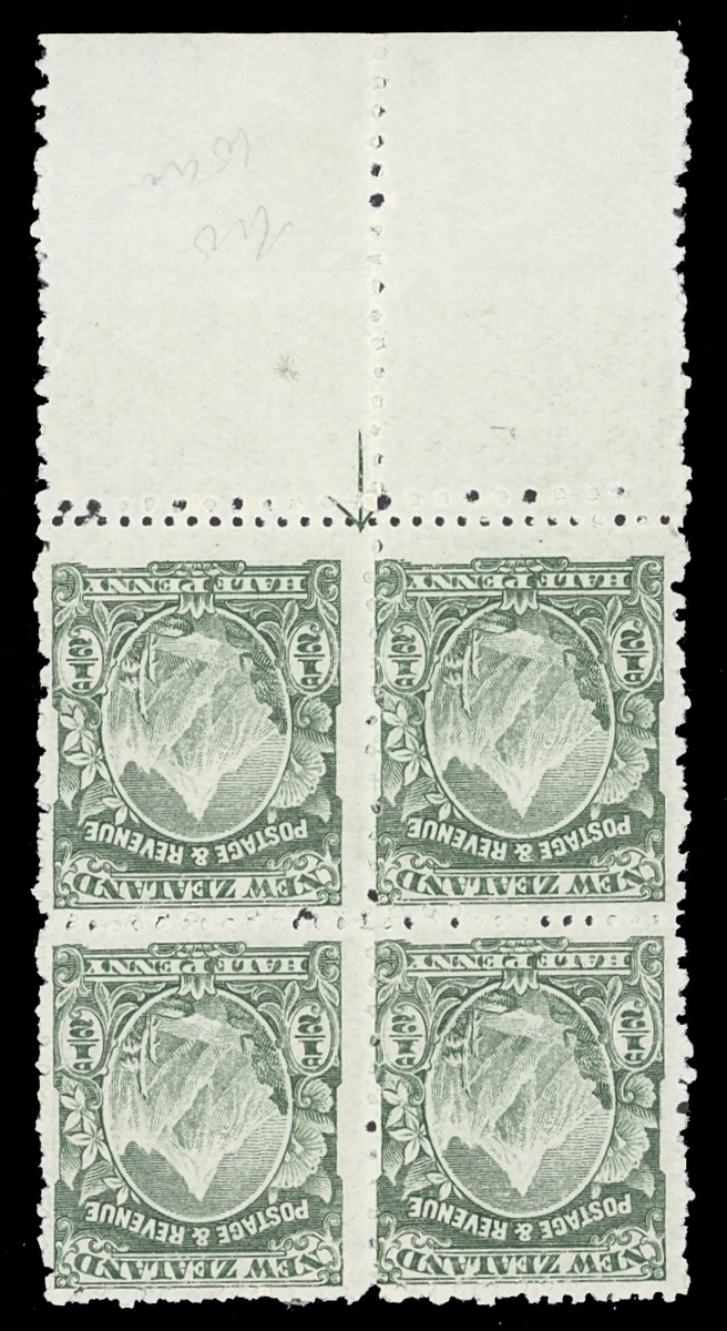 No watermark, mixed horizontal perfs. ½d. Mount Cook, block of four from the foot of the sheet, original gum with the lower pair remaining unmounted mint, fine. S.G. 298, £720+