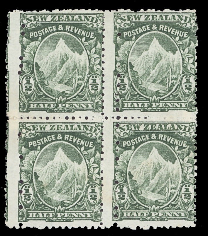No watermark, mixed vertical perfs., ½d. Mount Cook, block of four, block of four with original gum; centred to right, slight stains and the upper pair slightly creased. S.G. 298, £720+