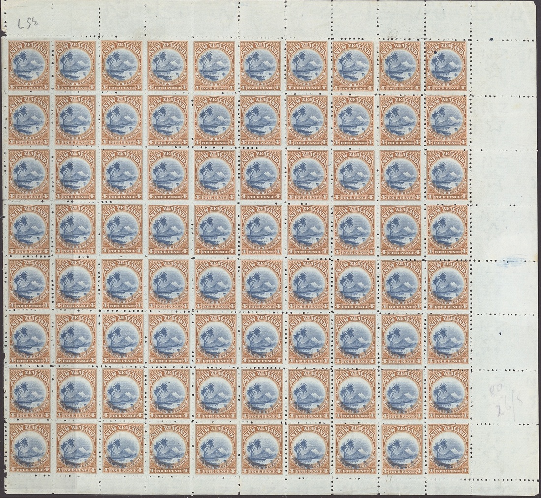 Perf. 11 4d. deep blue and deep brown Lake Taupo, complete sheet of 80 (10x8) with all the Campbell Patterson listed varieties, unmounted mint, a few small coloured marks on the reverse, fine and scarce. S.G. 310, £600. Campbell Patterson $4,020