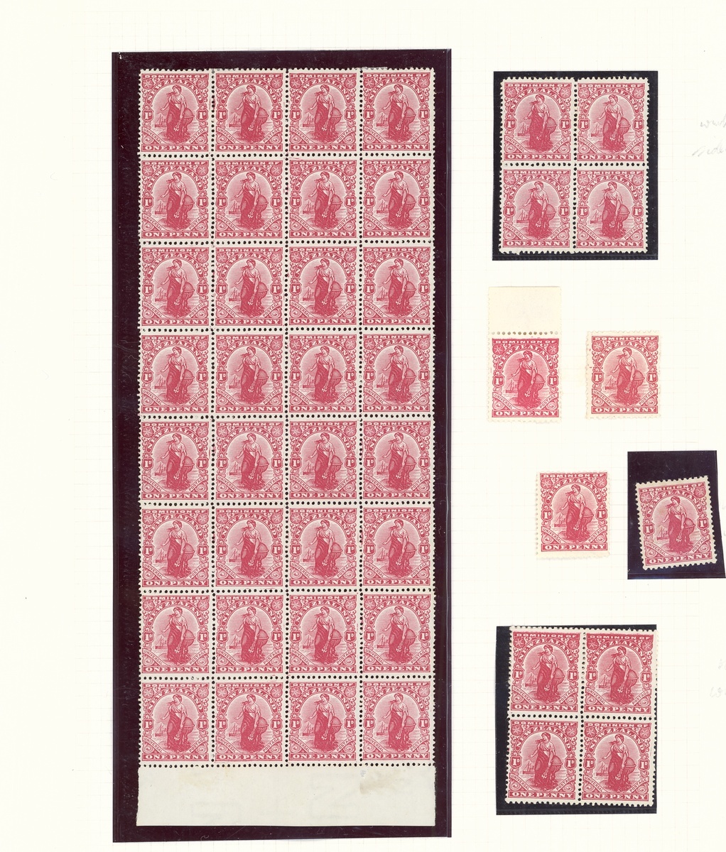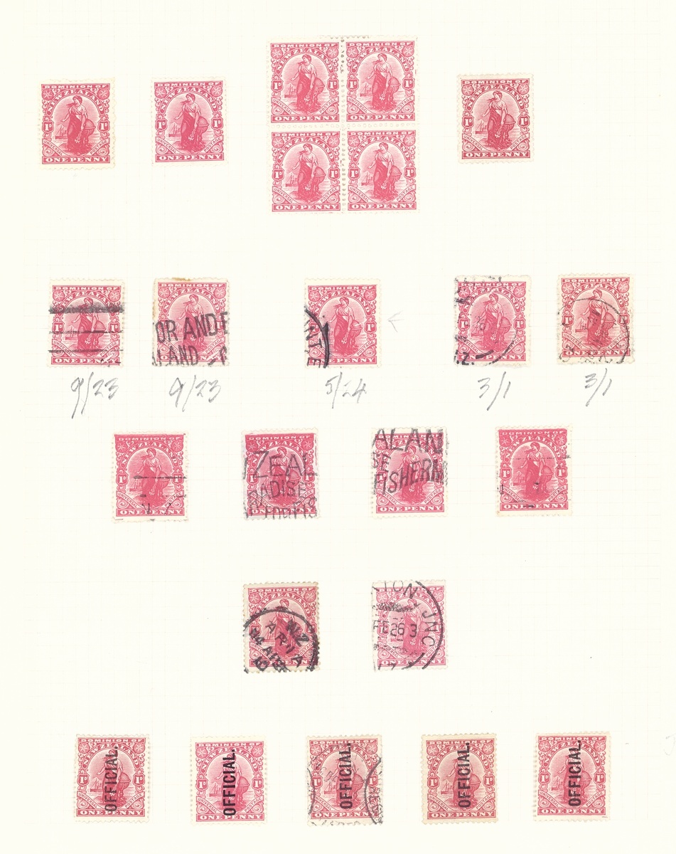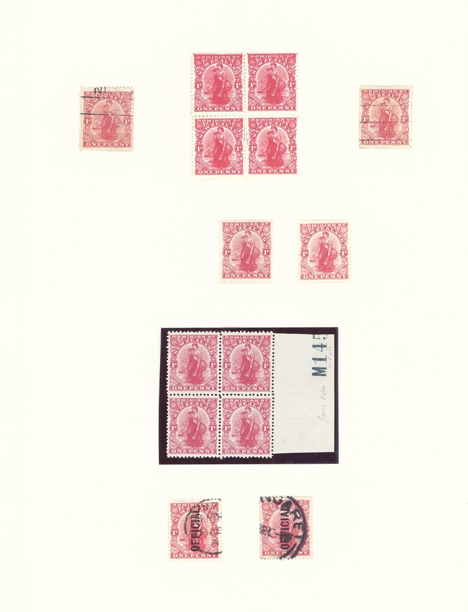 1909-27 1d. "Dominion", mint and used collection (220) on pages, including De La Rue with "Globe" flaws (2 mint, used), Official pair with full offset, Jones paper unmounted mint block of four and another with partial sheet number, unsurfaced paper block of four, sideways watermark block of 32, 21 with letters watermark and three without watermark, a good range of litho. watermarks in a range of colours including a block of four in black, Official blocks, Cowan paper with "feather", "Globe" and "N" varieties, Wiggins Teape paper with block of four with part sheet number, etc., chiefly good to fine