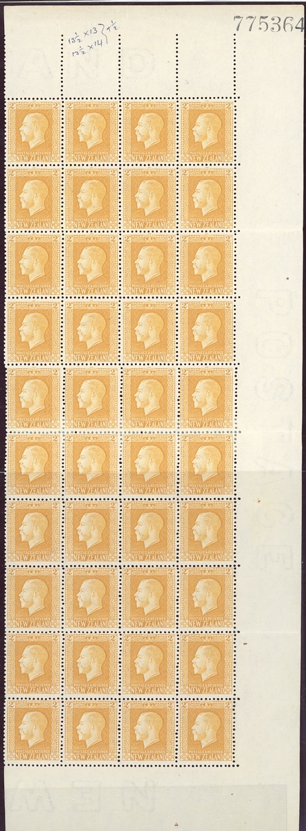2d. yellow, block of 40 (4 x 10) from the right of the sheet with four two perf. pairs and showing sheet number, mostly unmounted but strengthened by hinges through the central horizontal row of perfs. (affecting the 2 perf. pairs); fine. S.G. 418, 418b