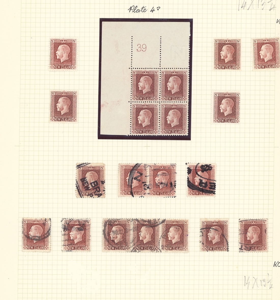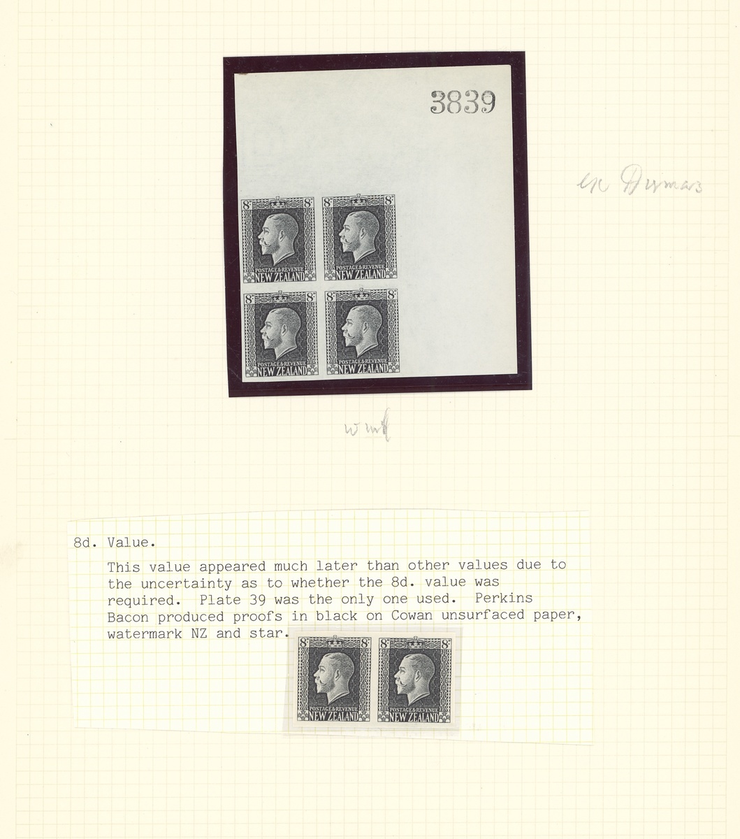 8d. red-brown, comprising imperf. Plate Proof in black (pair and block of four), issued stamps with 5 mint singles, Plate number 39 Plate number block of four from the upper left corner of the sheet (Campbell Patterson $1,150), 11 used, chiefly fine. S.G. 428