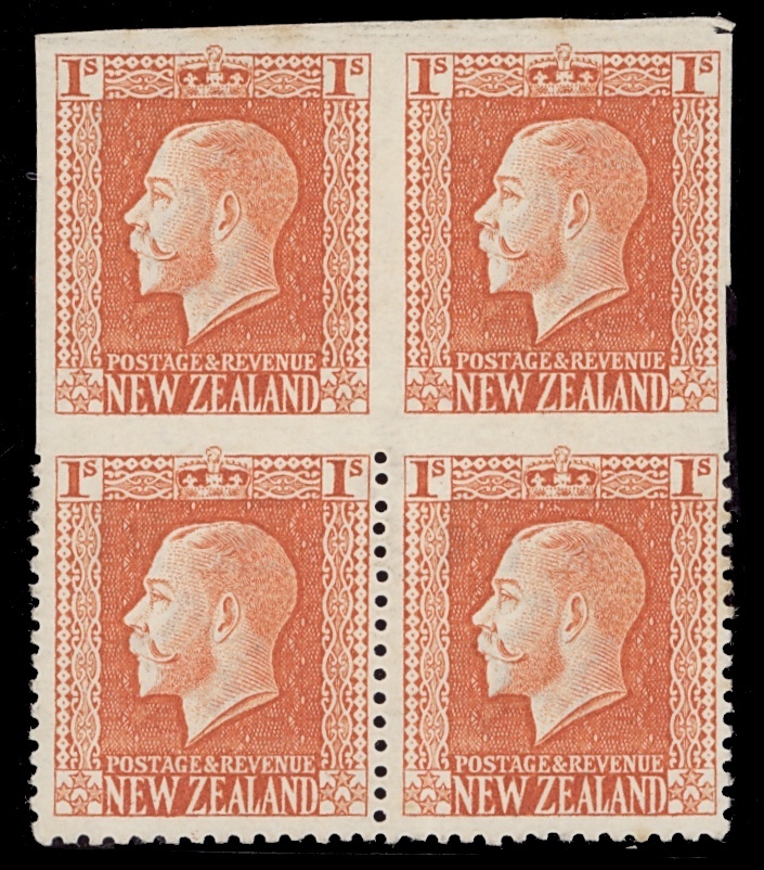 1/- pale orange-red, block of four containing two pairs imperf. (top stamp of a vertical pair), original gum; some very tiny traces of staining. Fine and rare. R.P.S. of N.Z. Certificate (1956). S.G. 430cba, £1,500+. Photo