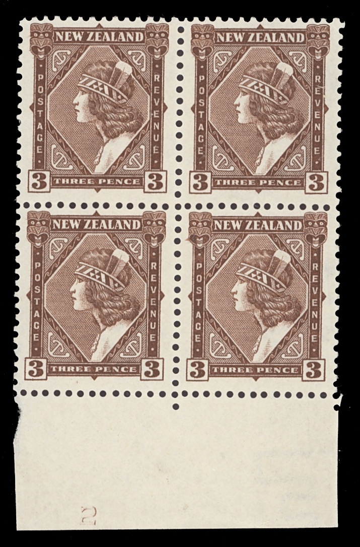 3d. brown, Maori Girl, single watermark, Plate number 2 block of four from the foot of the sheet, without selvedge at left (Campbell Patterson $5,500 as complete), unmounted mint, minor gum bends, fine. S.G 561