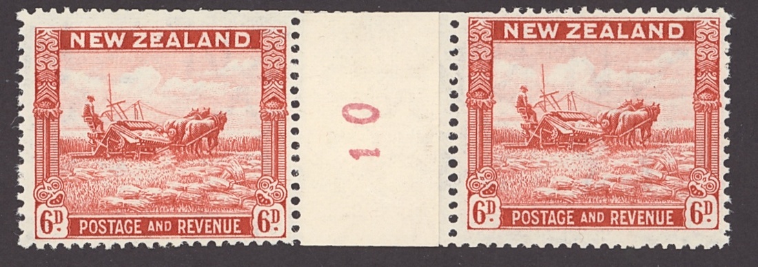 6d. scarlet, Harvesting, multiple watermark, perf. 14½ x 14, coil ("10") pair, unmounted mint, very faint toning on reverse; rare. S.G. 585c, Campbell Patterson L9e(Y), $6,000. Photo