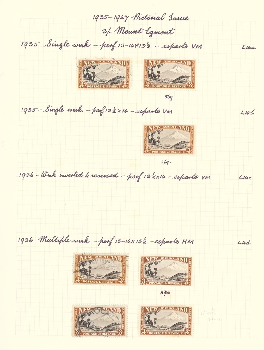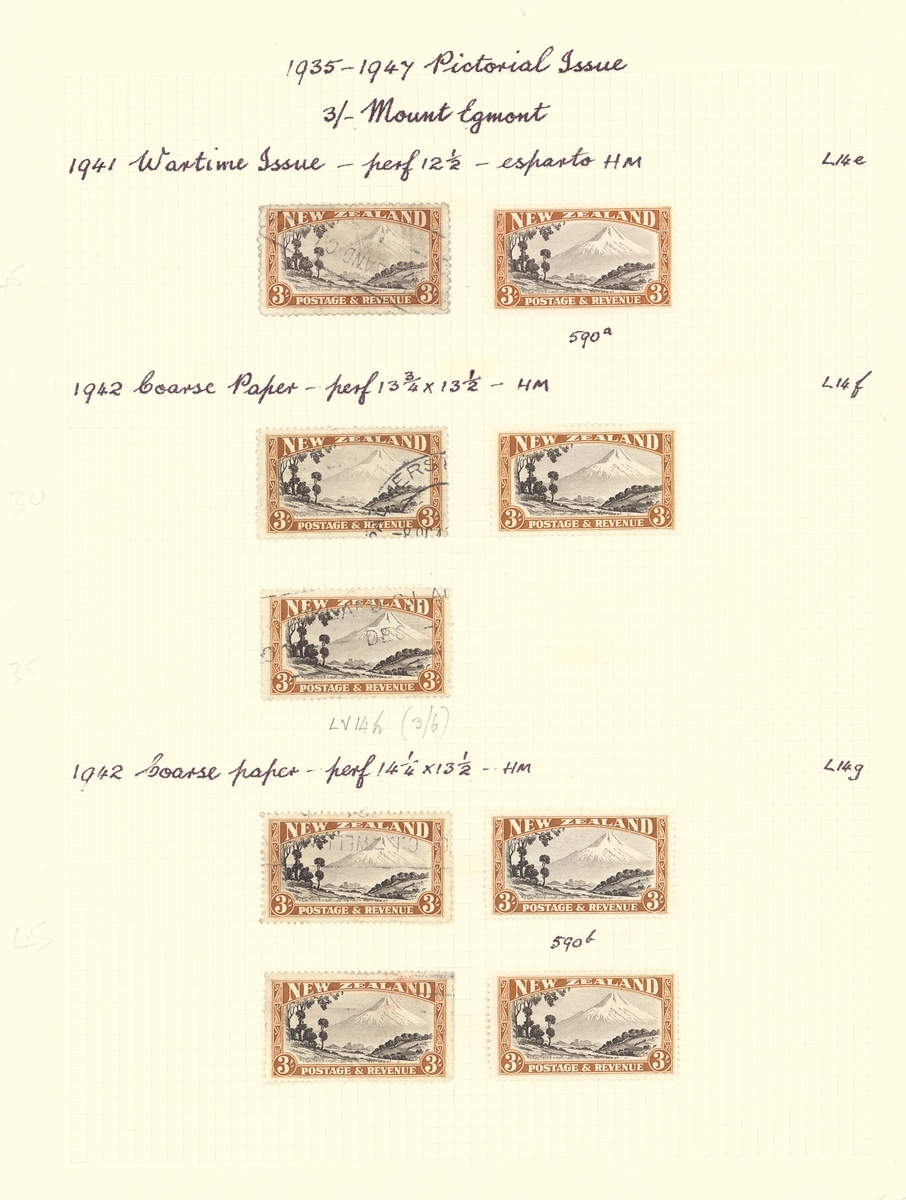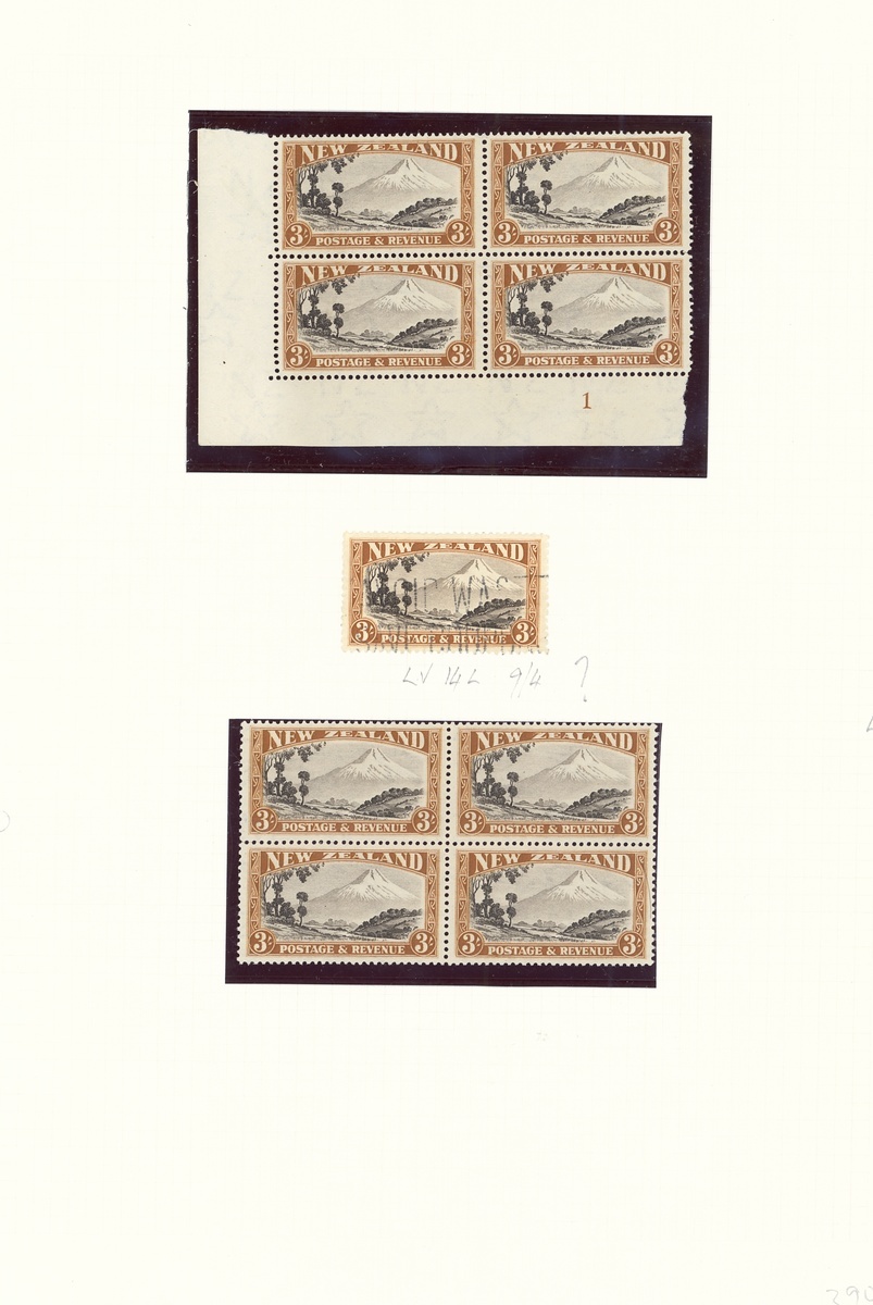 3/- chocolate and yellow-brown, Mount Egmont, mint (12) and used (9) selection on pages, both watermarks, with Plate "1" block of four, re-entries, multiple watermark inverted (stain), etc., chiefly fine150.