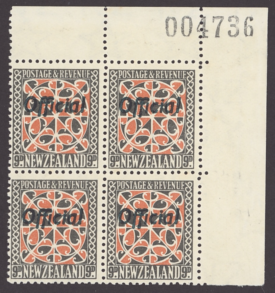 9d. red and grey-black, Maori panel, block of four from the upper-right corner of the sheet with serial number, unmounted mint, hinged in the margin, fine and scarce. S.G. O129, Campbell Patterson $1,750. Photo