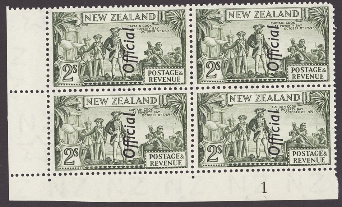2/- olive green, Captain Cook, Plate 1 block of four from the lower left corner of the sheet (Campbell Patterson $1,400), unmounted mint, blunt corner perf. at upper right; fine. S.G. O132,