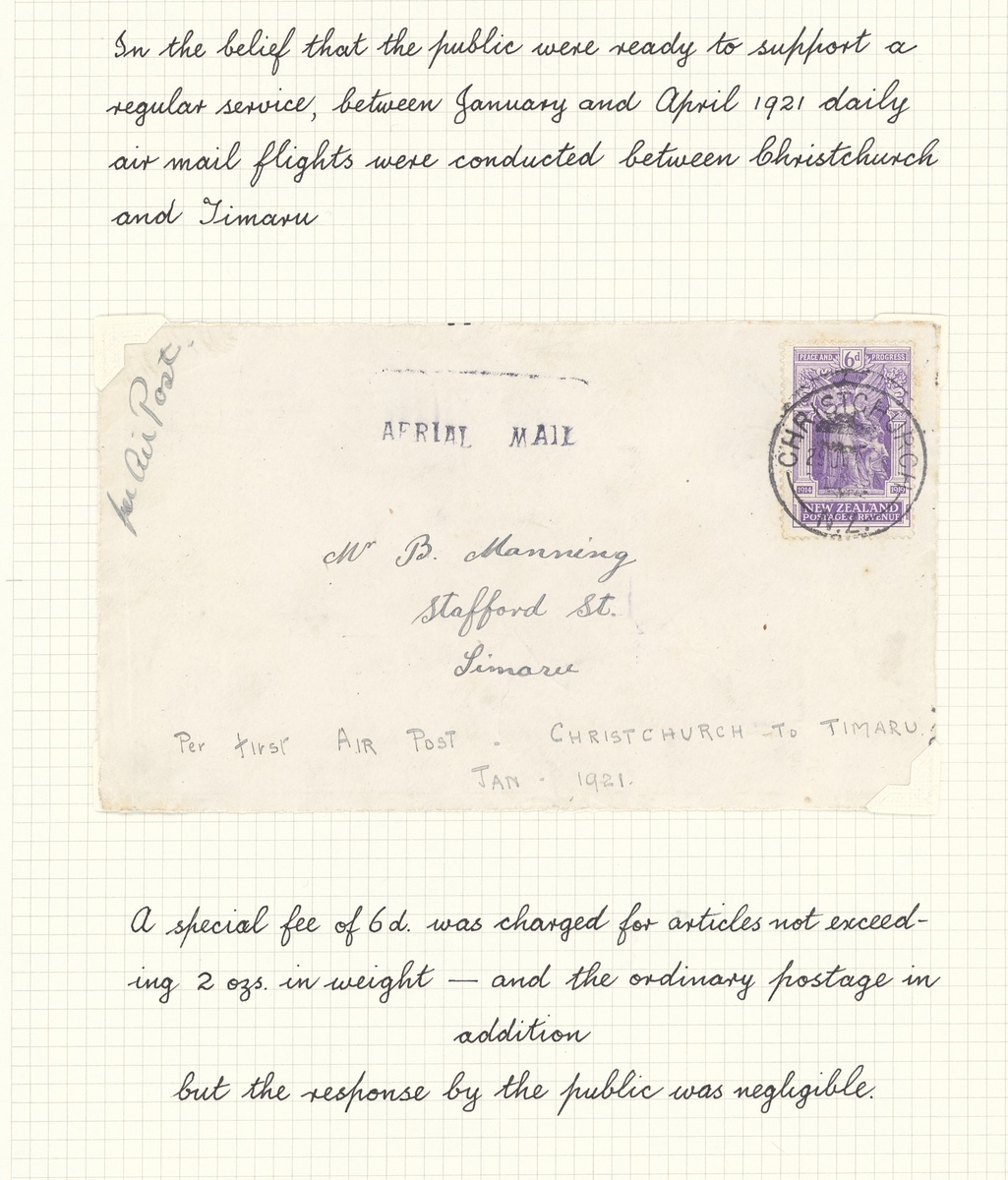 1921 (29 Jan.) first Air Mail flight from Christchurch to Timaru, front franked 1920 Victory 6d., endorsed per Air Post and with