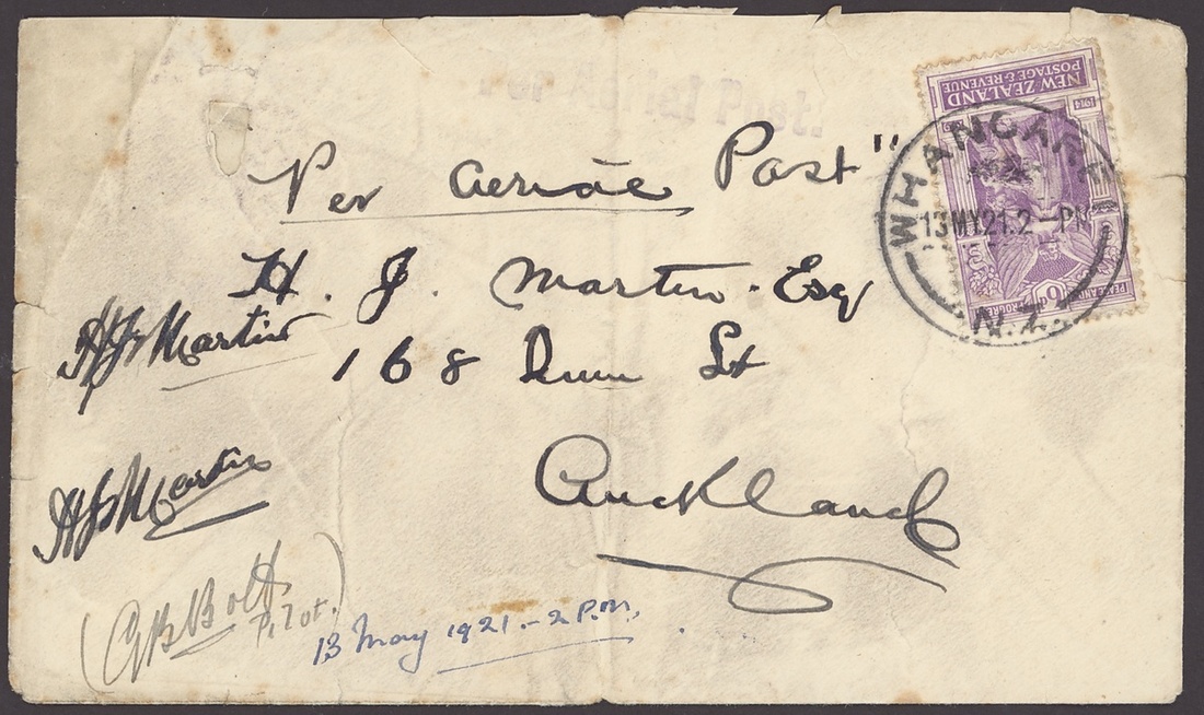 1921 (13 May) Whangerie to Auckland flight, cover franked 1920 Victory 6d., endorsed Per Aerial Post and signed by the pilot G.B. Bolt, faint "Per Aerial Post" cachet; the envelope creased, stained and with other faults but extremely rare. Stapleton 28b, $1,200. Photo