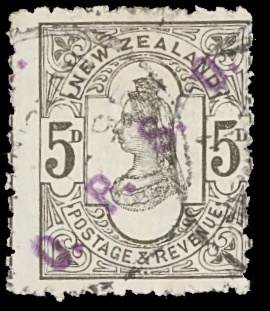 Overprinted O.P.S.O: 1888-95 7mm. watermark, 5d. olive-black, overprint in violet, used with Wellington A-class postmark dated 1895, fine. R.P.S.N.Z. Certificate (2019). CP DP7a (2), $4,000