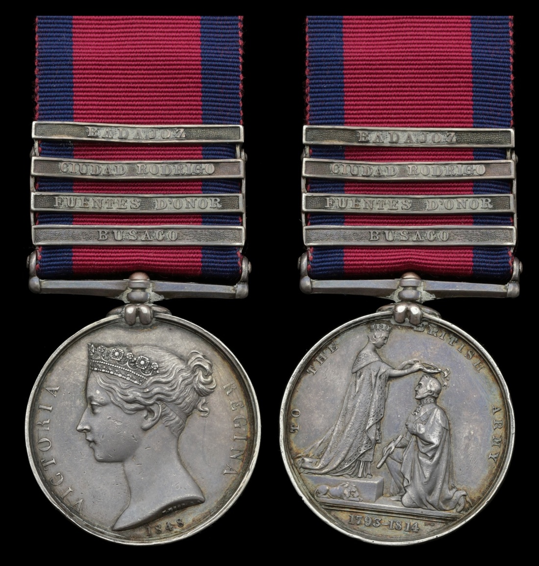 Richard Hawke served with the 5th (Northumberland) Regiment of Foot during the Peninsula War and is confirmed on the roll with entitlement to this Medal and clasps. The unit saw a great deal of service in Spain and Portugal, earning themselves nicknames including "The Old and Bold"; "The Fighting Fifth"; and "Lord Wellington's Bodyguard" along the way. They played a particularly prominent part in the Battle of El Bodon (25 September 1811) when, as part of a rearguard they defended a position against repeated attacks by the French - at one stage even carrying out a bayonet charge against French cavalry which had captured a battery of Portuguese artillery. The battalion commander, Major Henry Ridge, left an account of the action and was praised by Wellington himself on the dispositions he had made to resist their foe, later being mentioned by name in a General Order.
