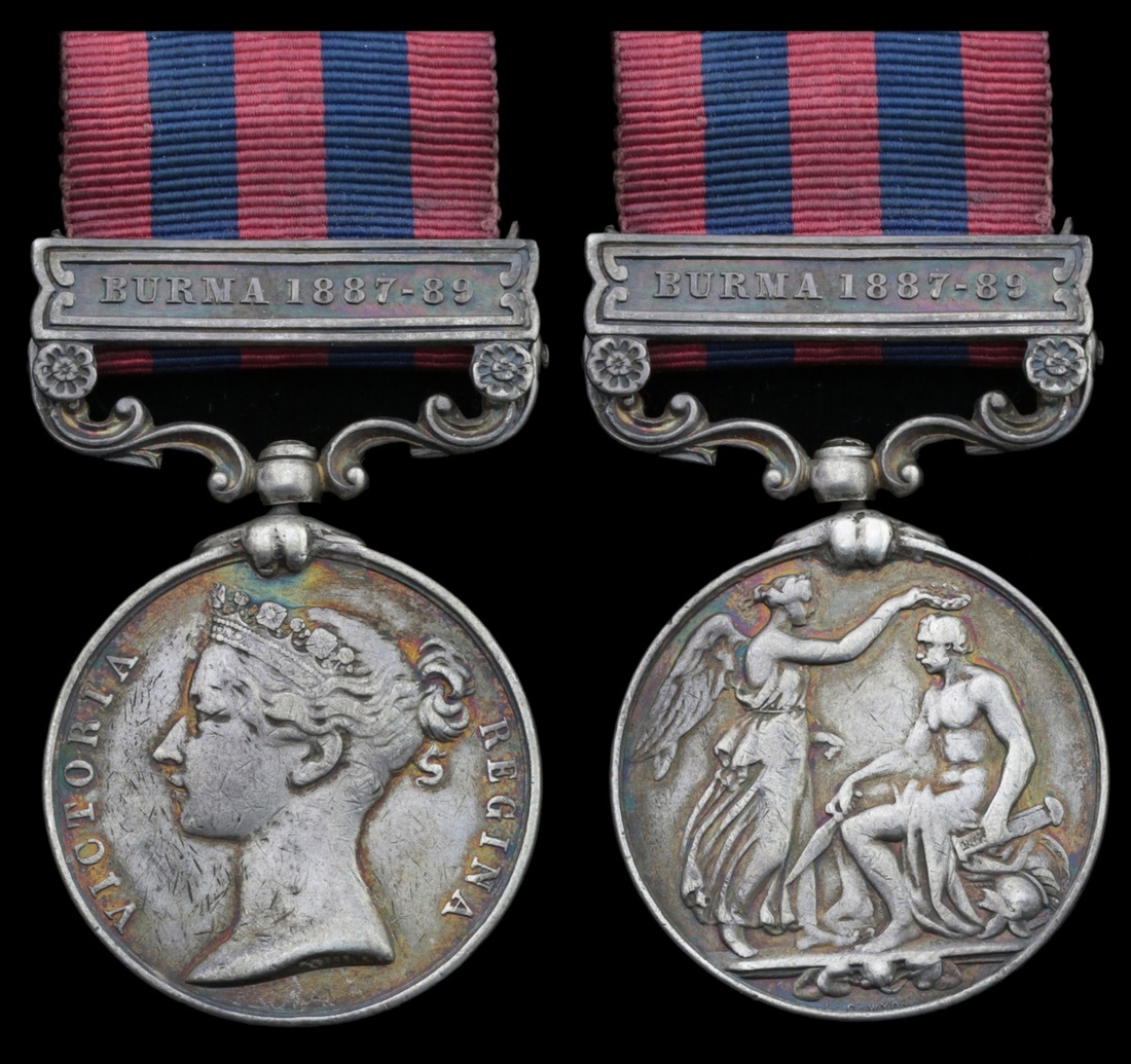 India General Service 1854-95, 1 clasp, Burma 1887-89 ([...] Singh. Mandabere [...]), naming heavily worn, suspension very loose, heavy contact wear overall, overall fair