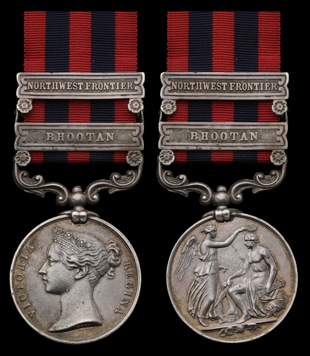 India General Service 1854-95, 2 clasps, Bhootan, Northwest Frontier (Havildar Davee Sing Rajpoot 66th or Goorkha Regt.), claw tightened, top clasp drilled, very fine