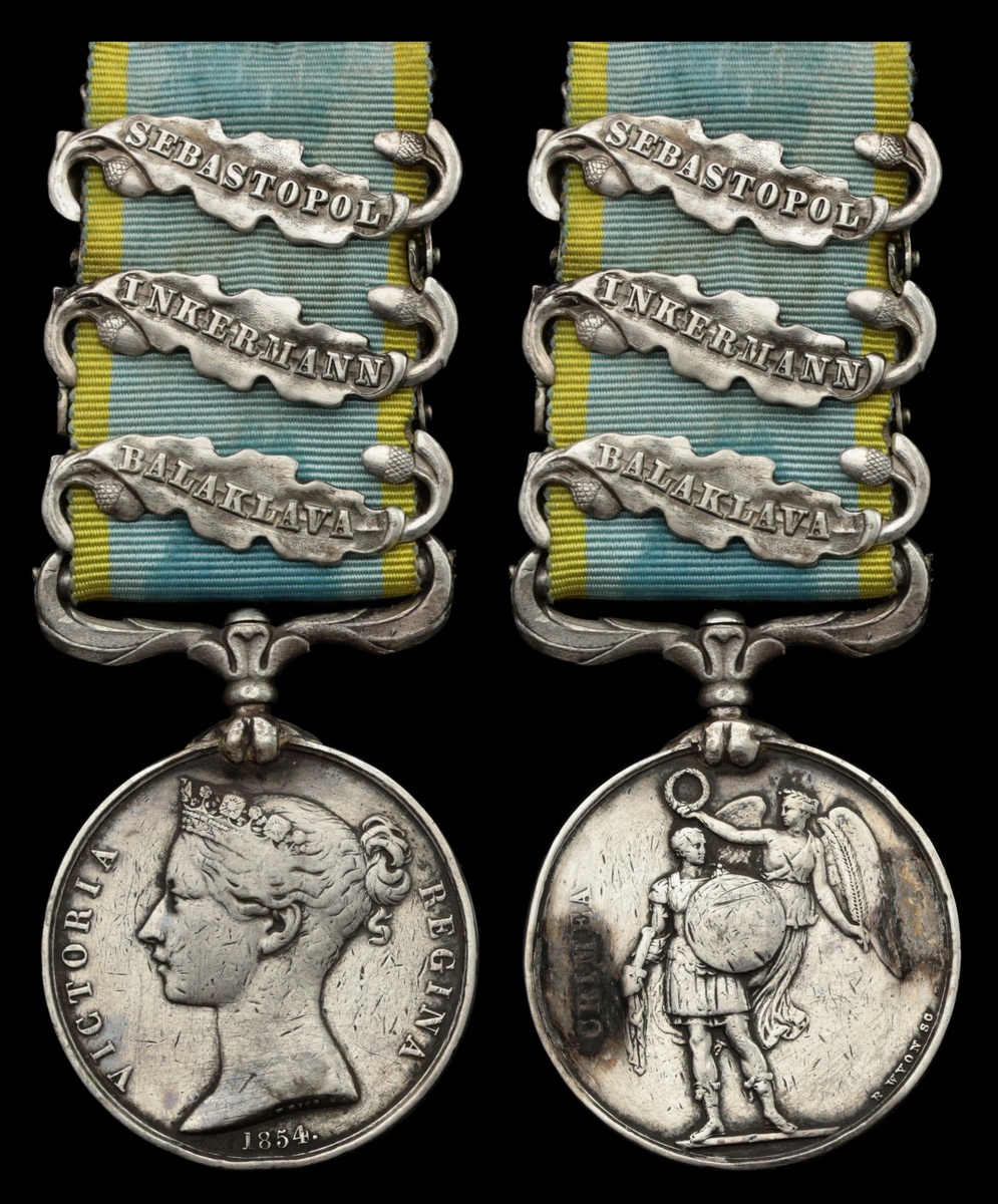 Crimea 1854-56, 3 clasps, Balaklava, Inkermann, Sebastopol (Priv. Joseph Butcher, 23rd F [...]), contemporarily engraved naming, ex-brooch mounted, marks visible on reverse, worn, fine
