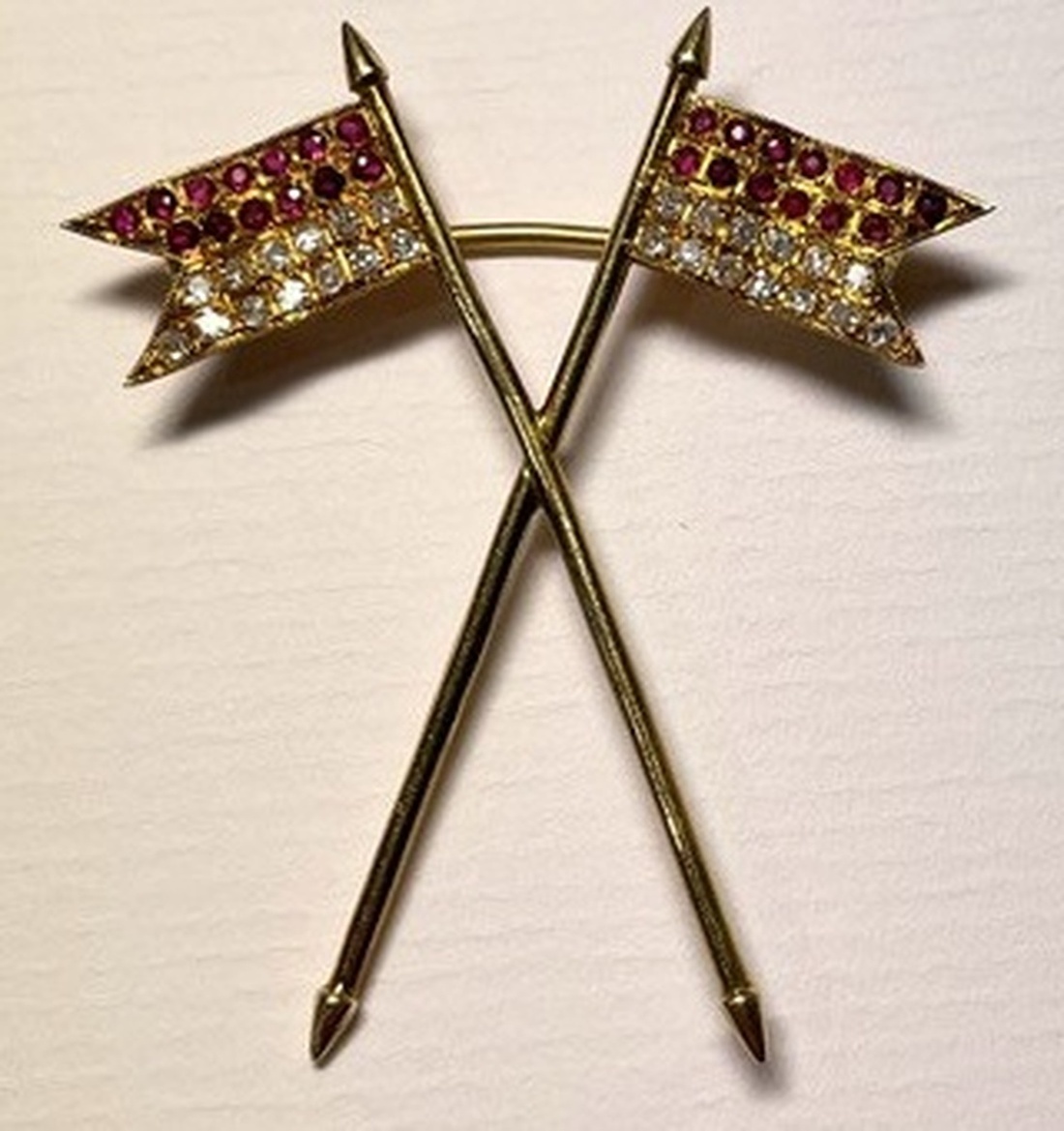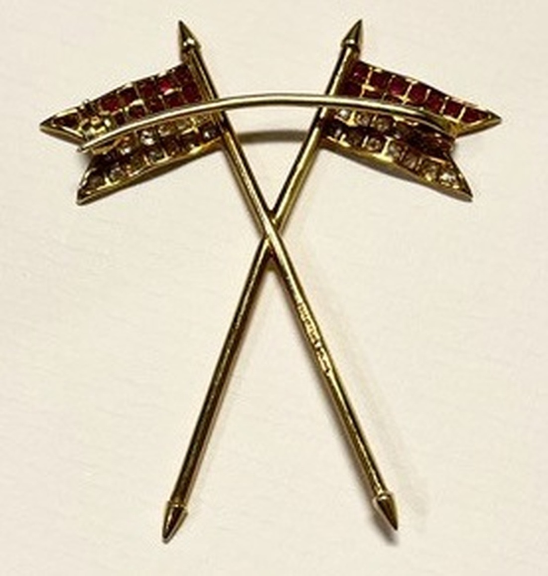 9th/12th Royal Lancers (Prince of Wales's) sweetheart brooch, gold (hallmarks for London 1978) with maker's initials 'JHL', the pennants enhanced with rubies and diamonds, with fittings for wear, good very fine