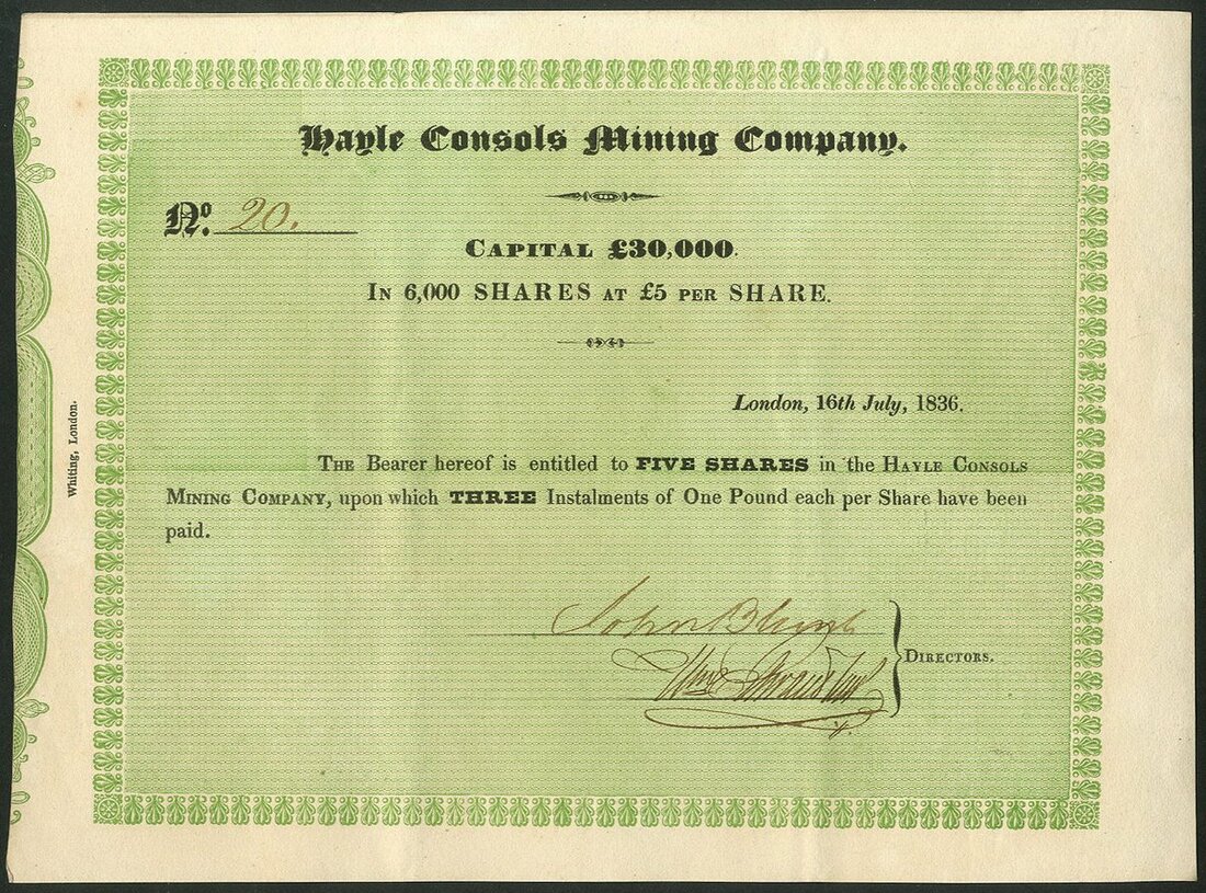 Great Britain: Hayle Consols Mining Company, 5 shares of £5, London 1836, #15, black with ornate green underprint. GVF.