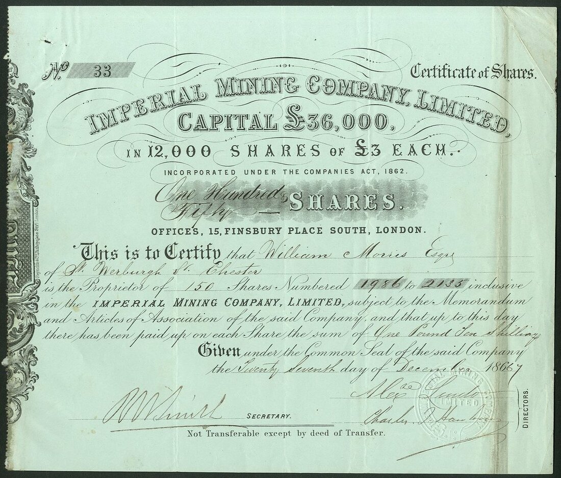 Great Britain: Imperial Mining Company Limited, £3 shares, 186[7], #33, black on green paper. Formed in 1867 to purchase mines in Glamorganshire which turned out to be almost worthless and the company was liquidated in 1870. Dirty crease at right otherwise VF and scarce.