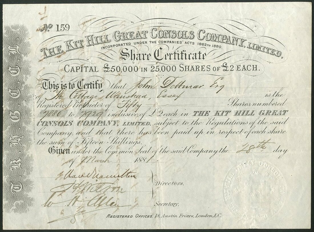 Great Britain: Kit Hill Great Consols Company Limited, £2 shares, 188[1], #159, black, attractive embossed seal depicts castle gates. Creased, VF and rare.