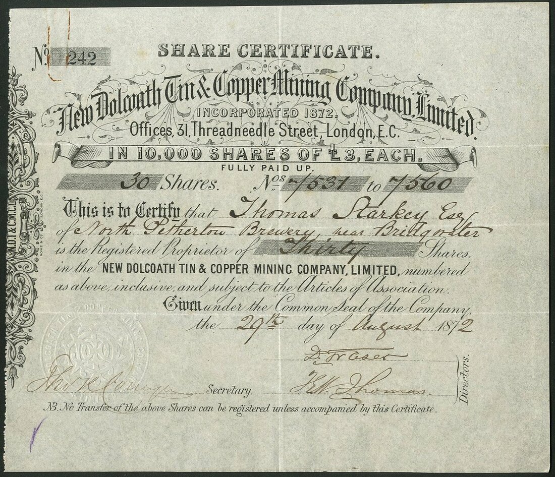 Great Britain: New Dolcoath Tin & Copper Mining Co. Ltd., £3 shares, 187[2], #242, black. GVF and rare.