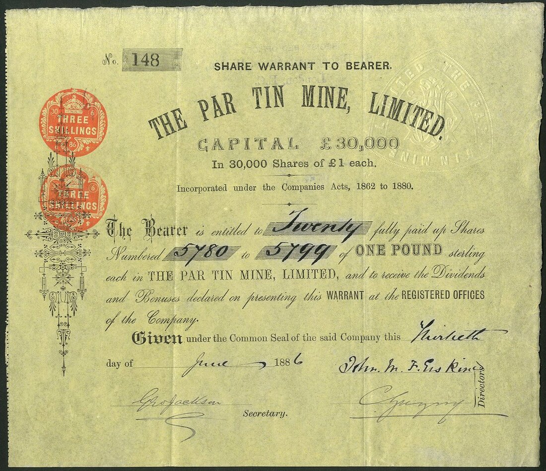 Great Britain: Par Tin Mine Limited, £1 shares, 188[6], #148, attractive black printing on yellow paper. VF and first time at auction>
