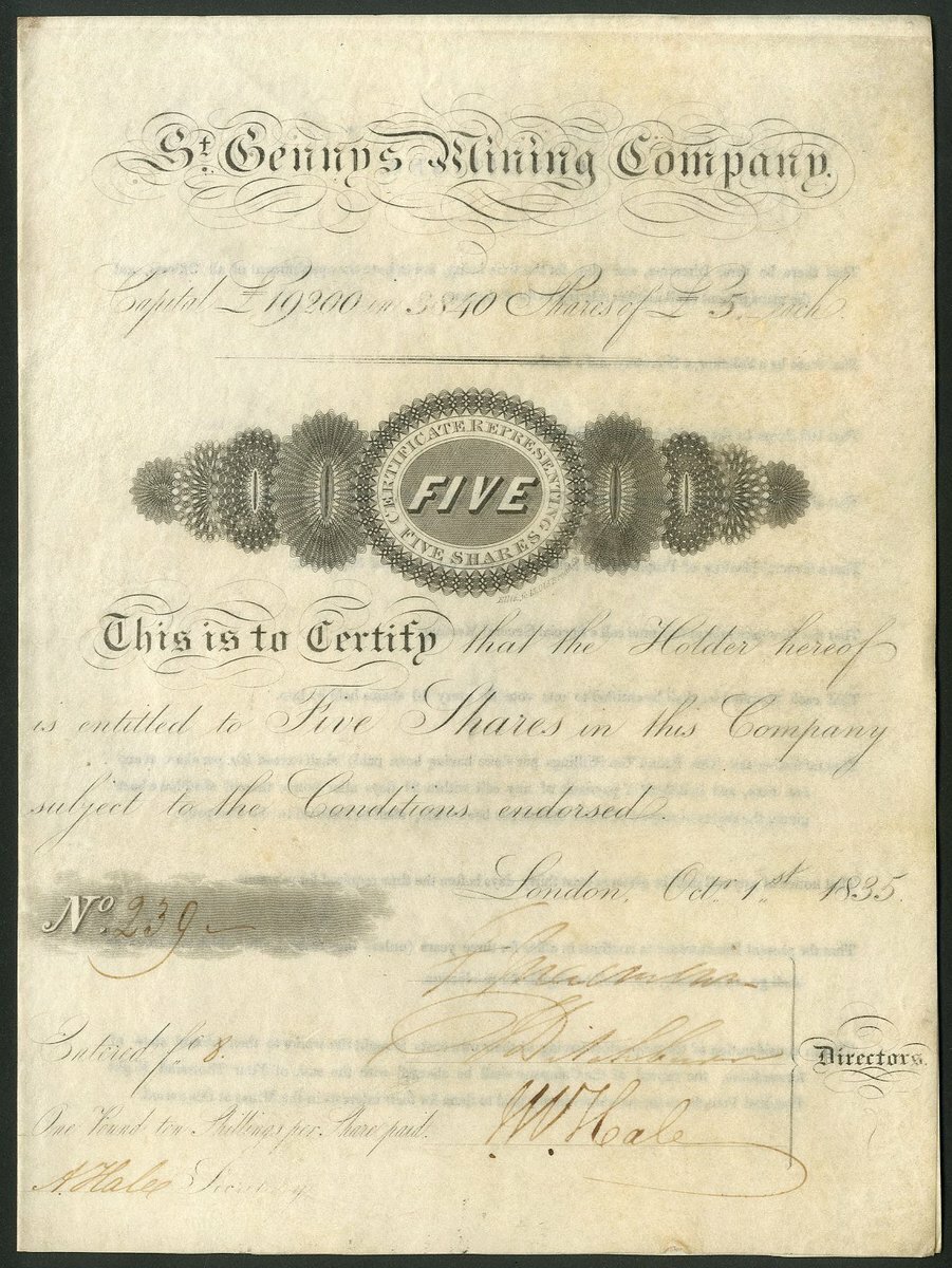 Great Britain: St.Gennys Mining Company, 5 shares of £5, 1835, #239, scrollwork in centre, black printing, on vellum, 4 pages with conditions printed on the inside. Mines at St. Gennys parish 7 miles from Bude, Cornwall. VF.