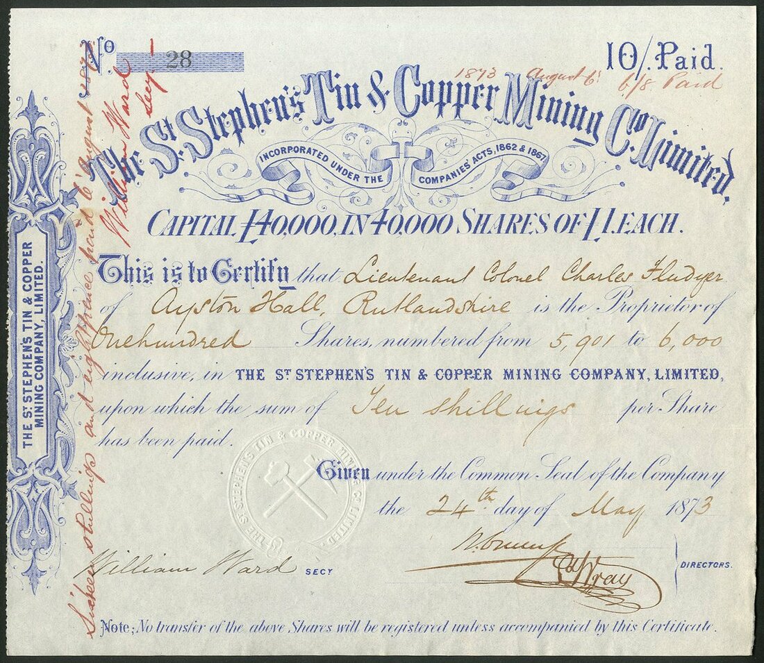 Great Britain: St.Stephen's Tin & Copper Mining Co. Ltd., £1 shares, part paid, 187([3], #28, scrollwork at left, blue, red handwritten endorsement, seal depicts pick and hammer. AEF.