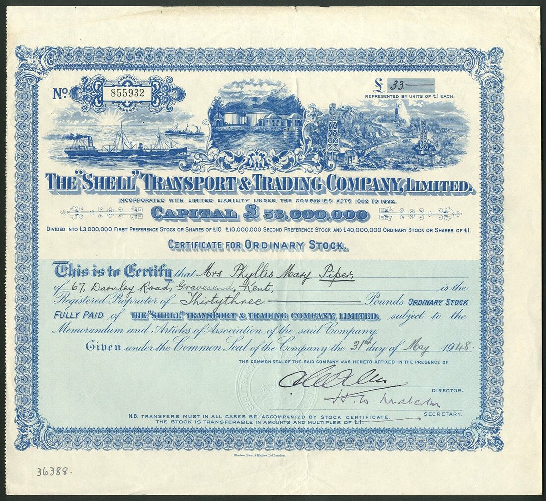 Great Britain: "Shell" Transport & Trading Co. Ltd., ordinary stock, 19[48], #855932, vignettes of oil wells, oil tanker and oil tanks, blue, capital £53 million. Founded in 1897 by Marcus Samuel, 1st Viscount Bearsted, and his brother Samuel Samuel, the company taking its name from their father's business of importing sea shells for Victorian collectors. VF.