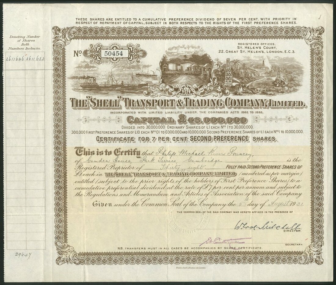 Great Britain: "Shell" Transport & Trading Co. Ltd., 7% Second Preference shares, 19[31], #50454, vignettes of oil wells, oil tanker and oil tanks, brown, capital £43 million. Founded in 1897 by Marcus Samuel, 1st Viscount Bearsted, and his brother Samuel Samuel, the company taking its name from their father's business of importing sea shells for Victorian collectors. VF.
