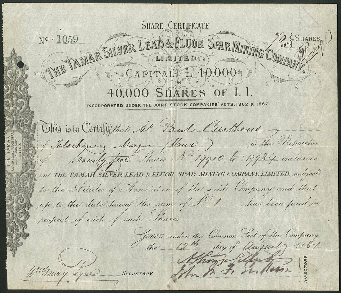 Great Britain: Tamar Silver Lead & Fluor Spar Mining Co. Ltd., £1 shares, 18[81], #1059, decorative title, black. Formed in 1878 and worked in the Bere Ferrers area of Devon. The Fluorspar (fluorite) was used as a flux in the smelting process. VF.