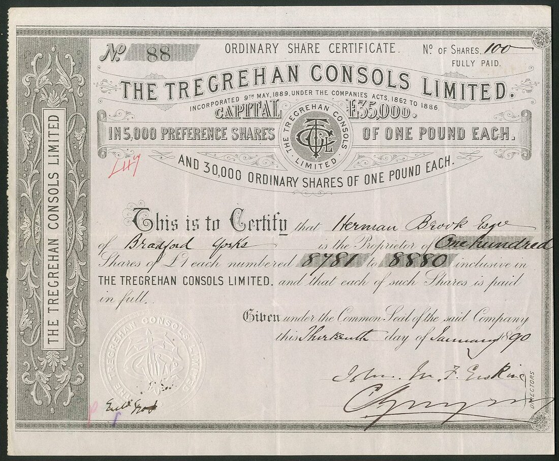 Great Britain: Tregrehan Consols Limited, £1 ordinary shares, 18[90], #88, black. Mines at Carlyon, St.Austell District, Cornwall. VF and rare. First time at auction.