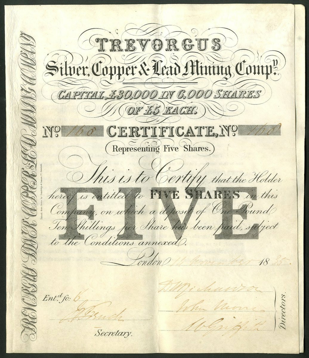 Great Britain: Trevorgus Silver, Copper & Lead Mining Company, 5 shares of £5, London 18[35], #168, company name at left, attractive heading, FIVE in underprint, black, on vellum, 4 pages with details of the company. Mine in the parish of St. Merryn, Cornwall. VF.