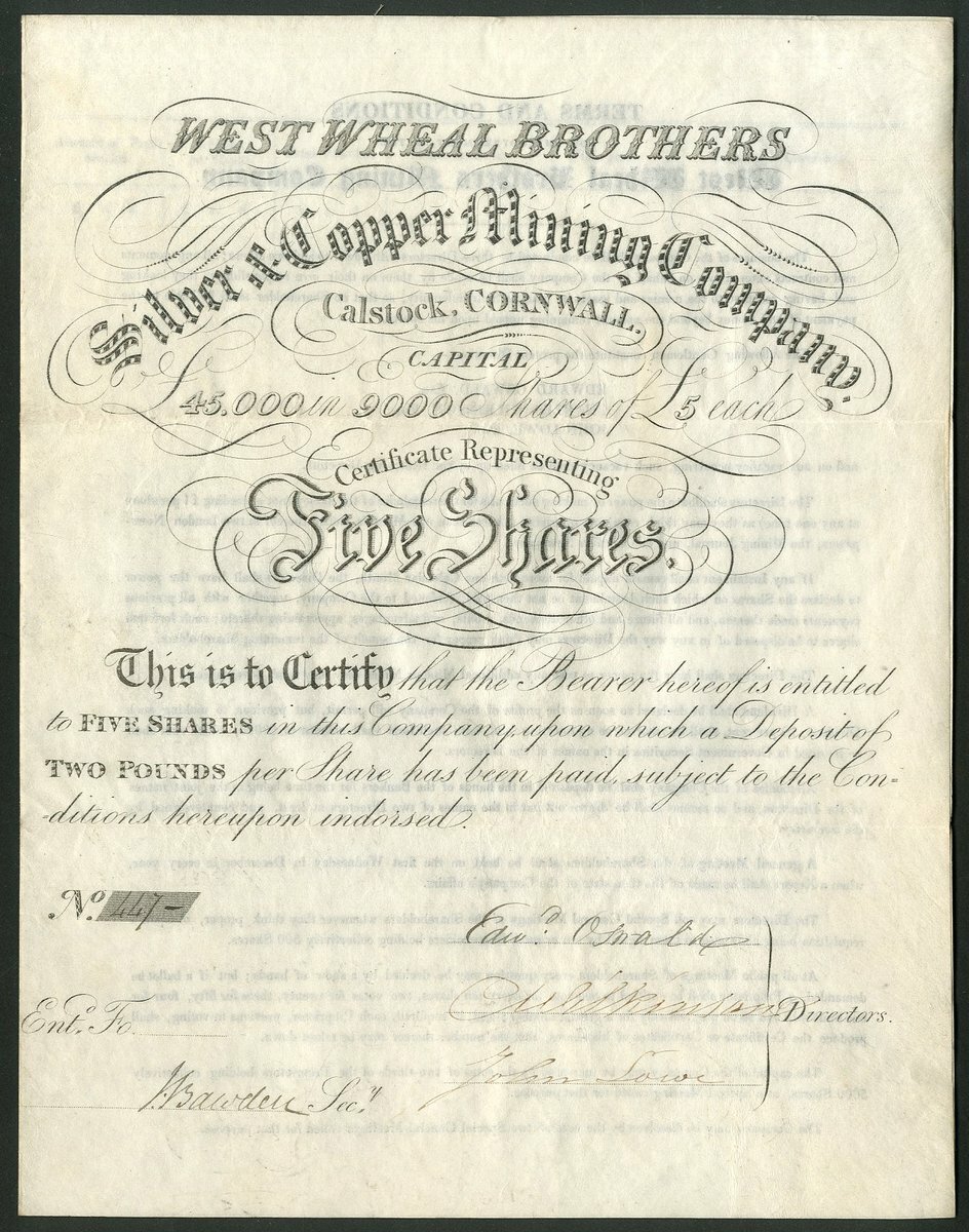 Great Britain: West Wheal Brothers Silver & Copper Mining Company, certificate for 5 shares of £5, £2 paid, undated but circa 1835, #447, black printing, on vellum, 4 pages with terms and conditions on the inside.