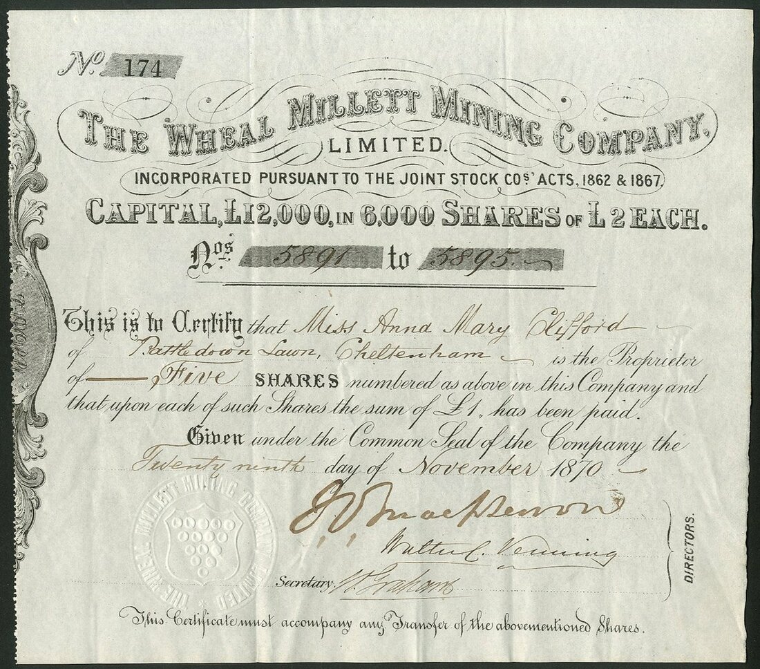 Great Britain: Wheal Millett Mining Co. Ltd., £2 shares, 1870, #174, black with scrollwork. Based in Crowan, Cornwall. GVF.