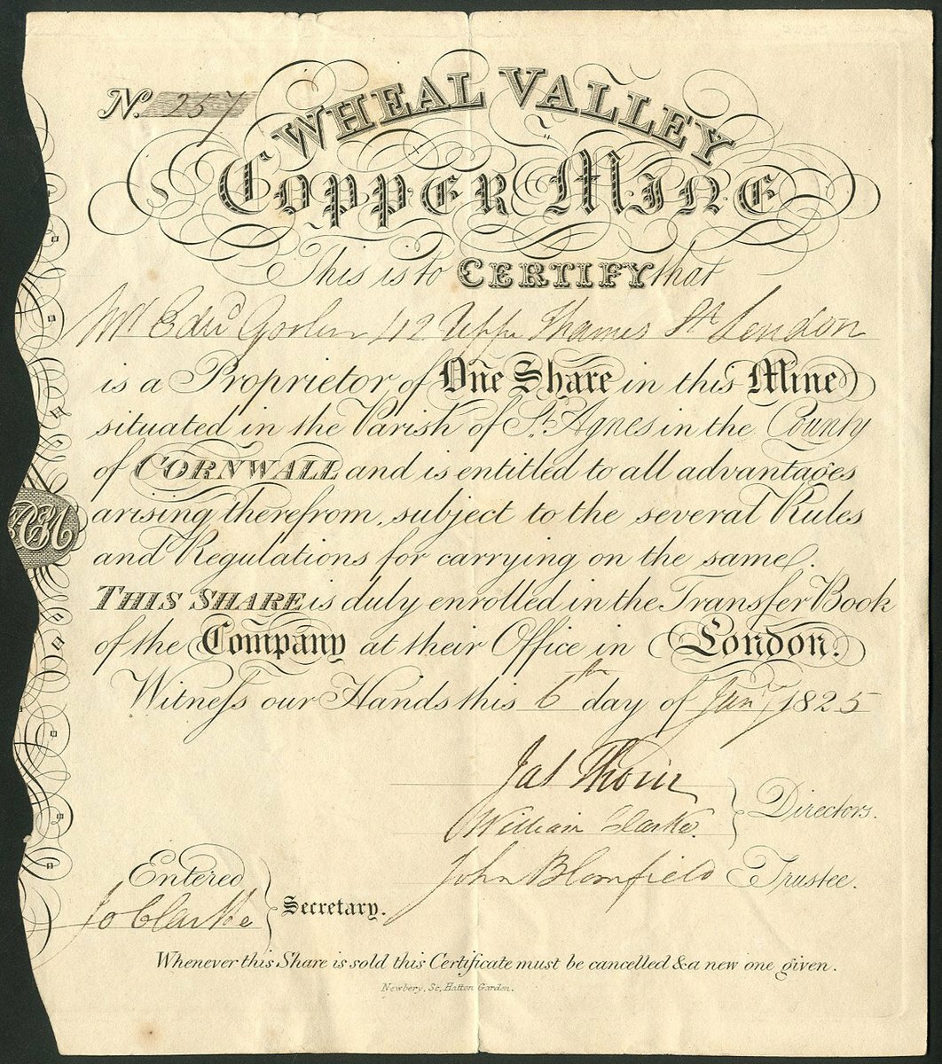 Great Britain: Wheal Valley Copper Mine, one share, London 182[5], #257, black on thick paper. Mine in the Parish of St.Agnes, Cornwall. A little creased but VF and rare.