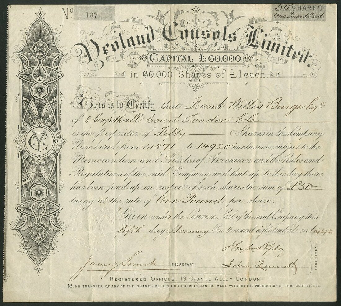 Great Britain: Yeoland Consols Limited, £1 shares, 18[82], #107, scrollwork at left, black. Mines in the Parish of Buckland, Devon, near Plymouth. AVF and rare.