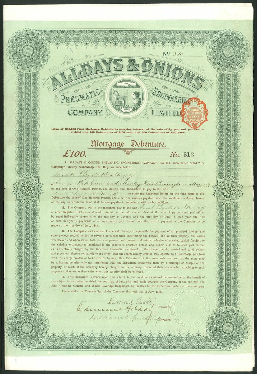 Great Britain: Alldays & Onions Pneumatic Engineering Co. Ltd., 4½% Mortgage debenture for £100, #313, 1898, large format piece with arms at top, ornate border, green and brown with green underprint, with coupons. This old Birmingham engineering company manufactured cycles and motorcycles and produced their first automobile, a small quadricycle, in 1898, followed by 7hp 4 seater model in 1900. Many more models were produced until the company merged in 1918 with Enfield which they had owned for some years. VF and scarce.